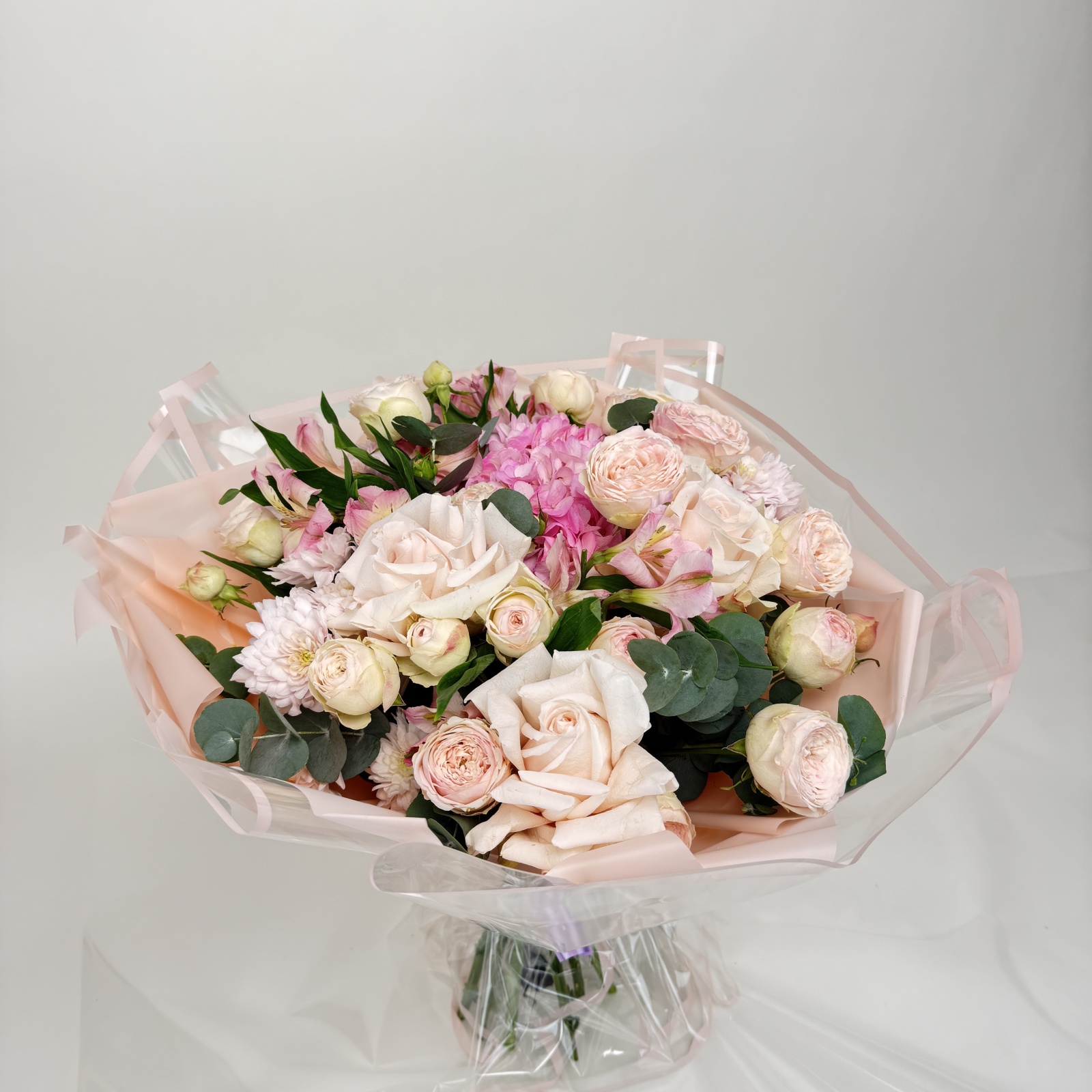 Состав: роза кустовая 5, хризантема кустовая 4, гвоздика 4, эвкалипт 3, роза 3, альстромерия 3, гортензия 1 и прочее. в наличии