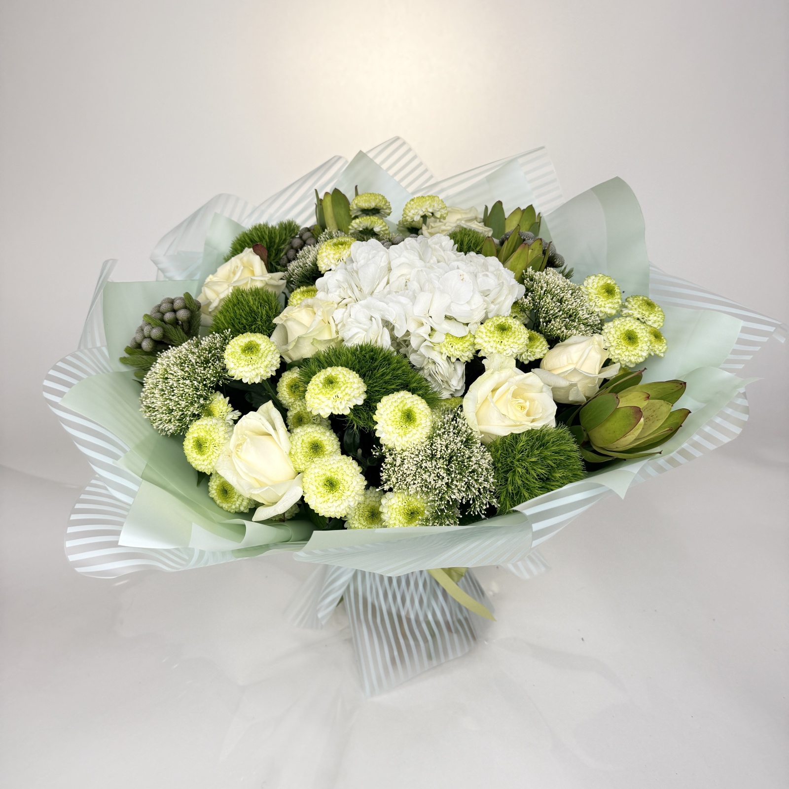 Состав: роза 7, хризантема кустовая 6, гвоздика 5, бруния 4, леукадендрон 4, гортензия 1, рускус 0,5 и прочее. в наличии