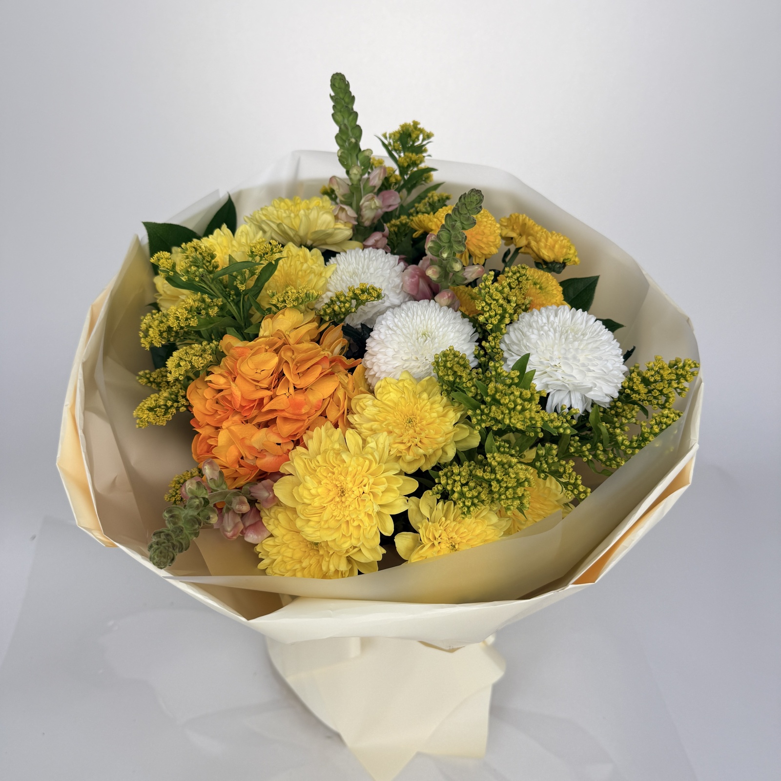 Состав: хризантема 3, хризантема кустовая 3, антирринум 3, солидаго 3, гортензия 1, салал 0,4 и прочее. в наличии