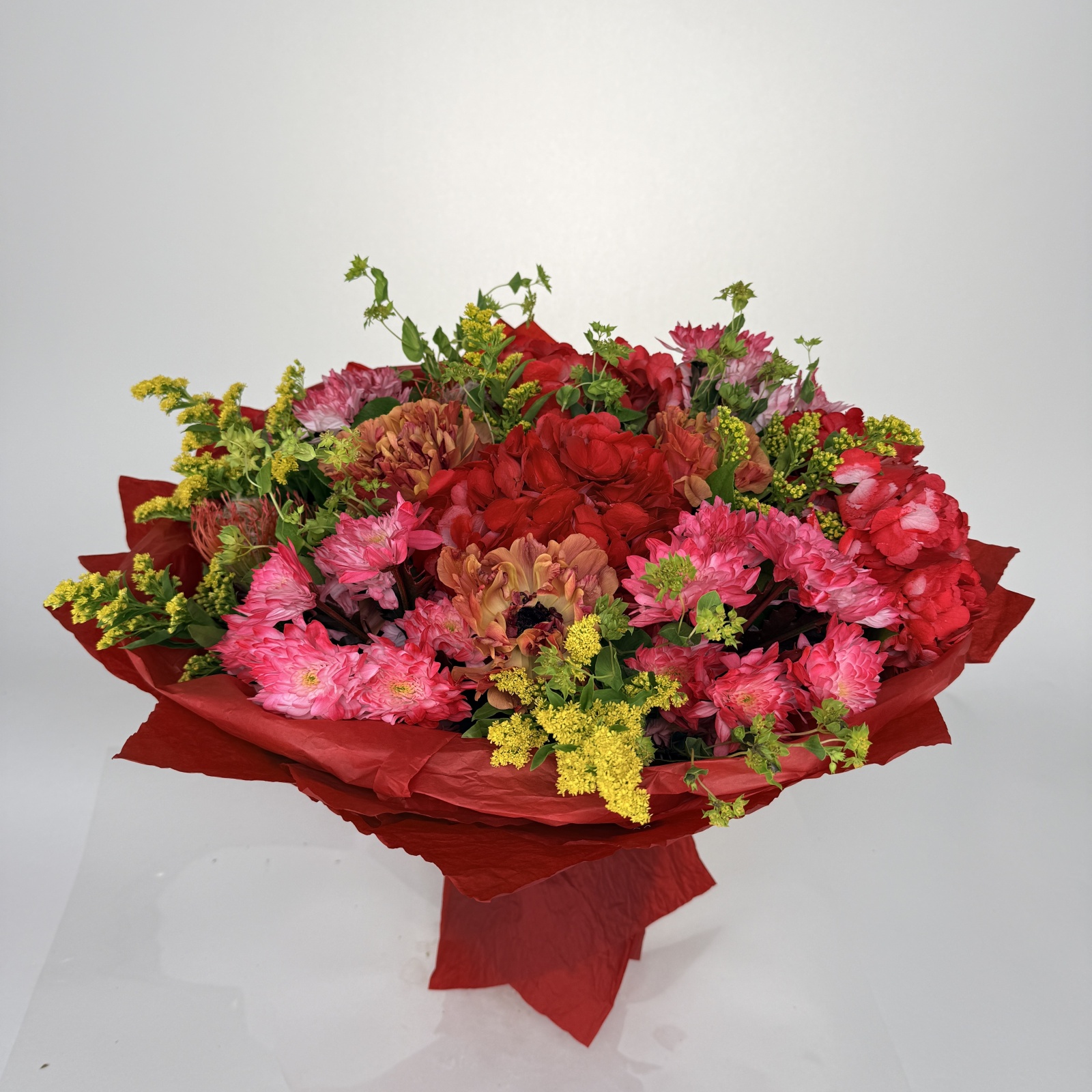 Состав: солидаго 5, хризантема кустовая 4, гортензия 3, ранункулюс 3, салал 0,5 и прочее. в наличии