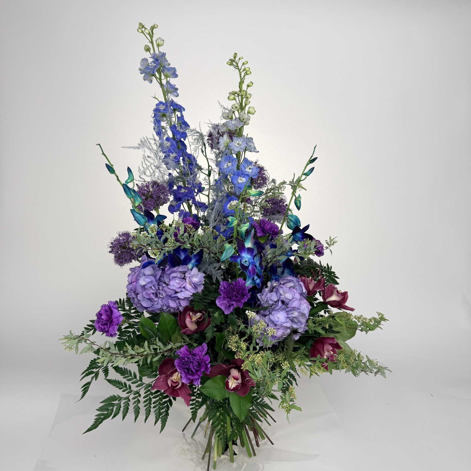 Состав: гвоздика 7, дендробиум 5, гортензия 3, дельфиниум 2, маттиола 1, папоротник 1, ветка цимбидиум 0,5 и прочее. в наличии
