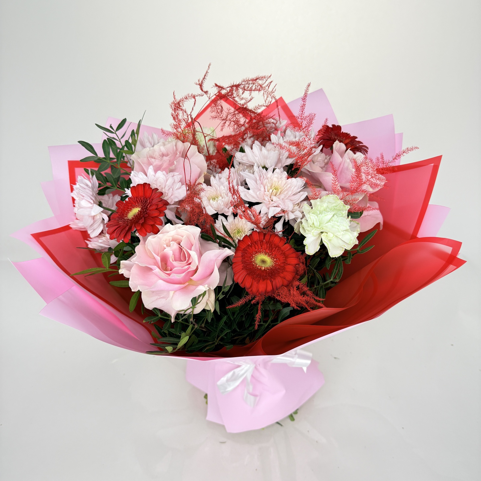 Состав: роза 11, хризантема кустовая 3, гербера 3, гвоздика 2, фисташка 0,5 и прочее. в наличии