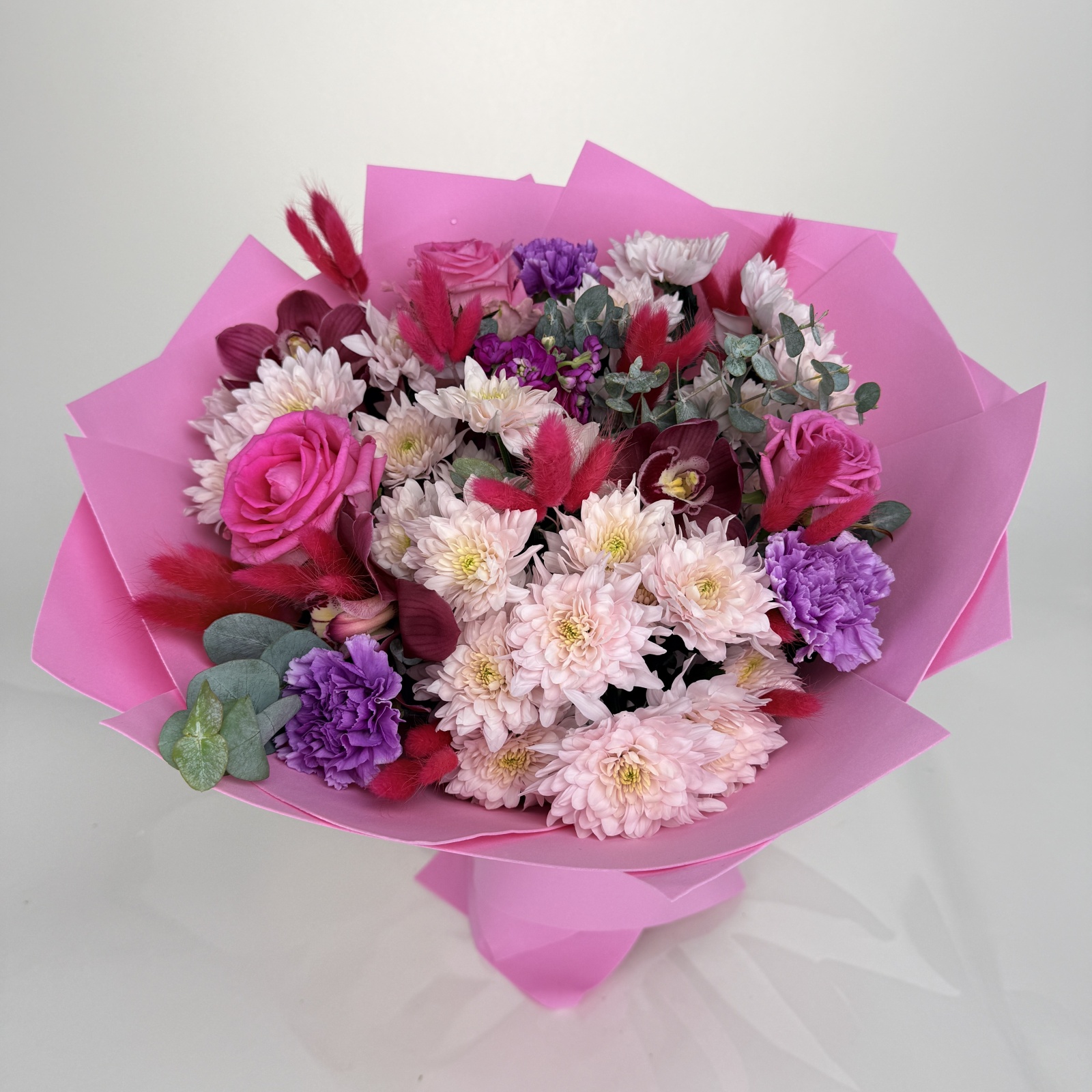 Состав: хризантема кустовая 5, роза 4, гвоздика 3, эвкалипт 2, маттиола 1, ветка цимбидиум 0,2 и прочее. в наличии