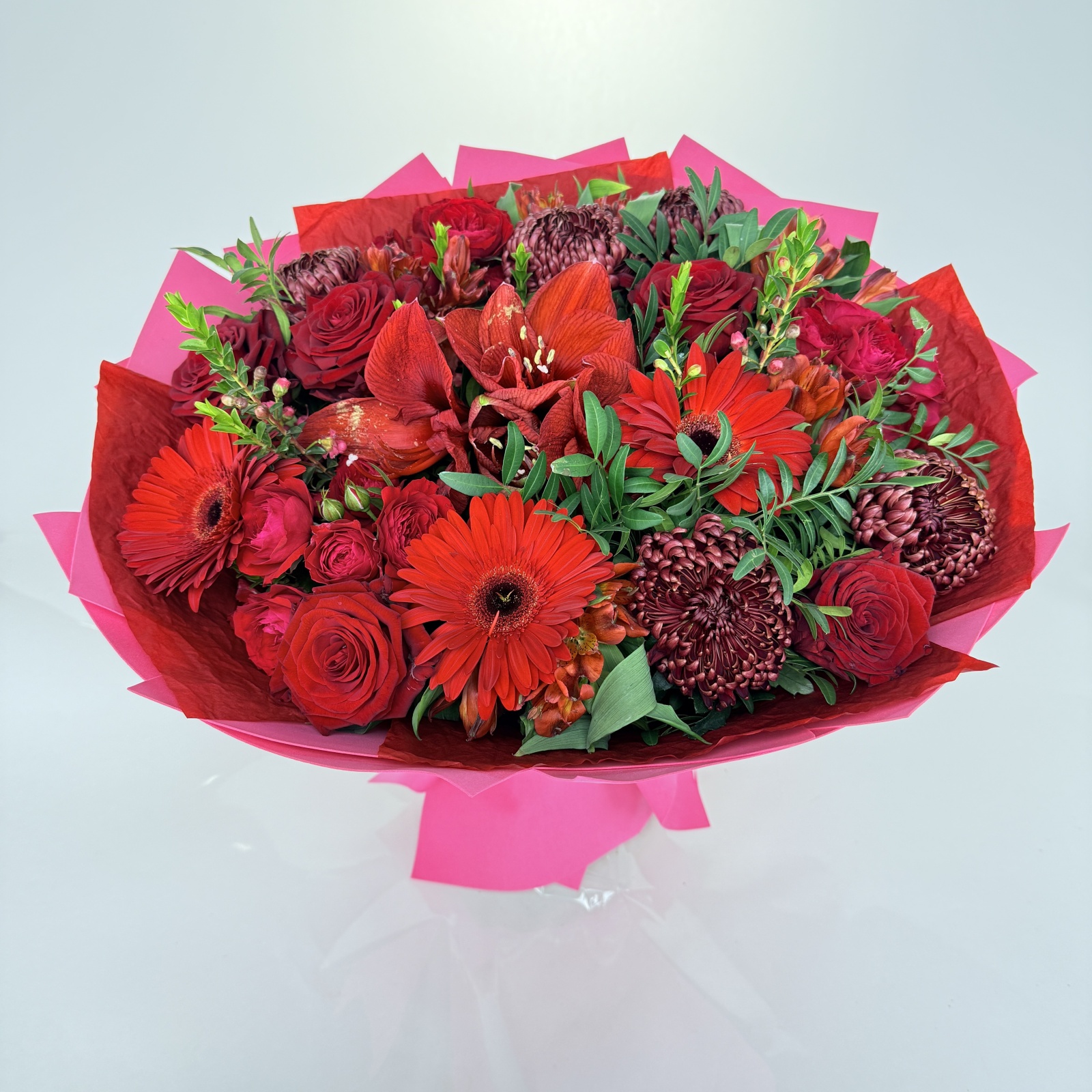 Состав: роза 5, альстромерия 5, хризантема 4, роза кустовая 3, гербера 3, хамелациум 2, фисташка 1 и прочее. в наличии