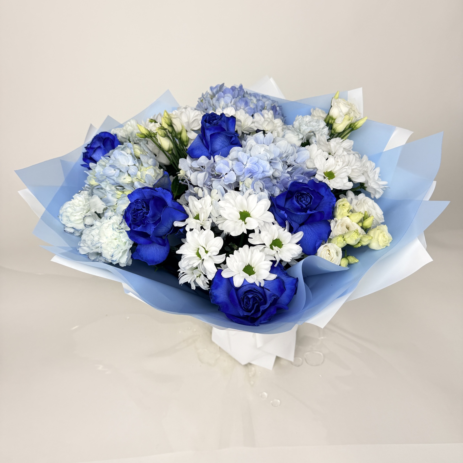 Состав: роза 8, гвоздика 5, хризантема кустовая 4, гортензия 3, лизиантус 3, рускус 0,5 и прочее. под заказ