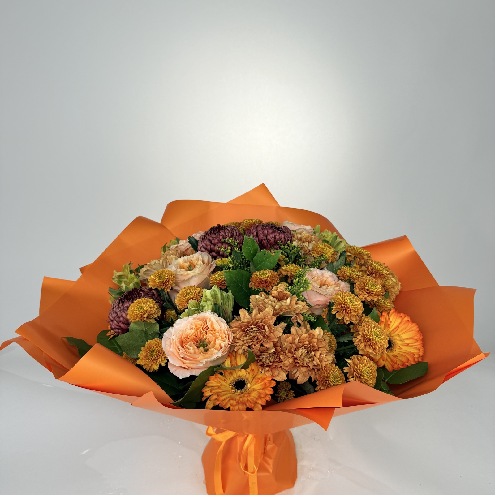Состав: хризантема кустовая 9, гербера 5, роза 5, альстромерия 5, хризантема 3, солидаго 3, салал 1 и прочее. под заказ