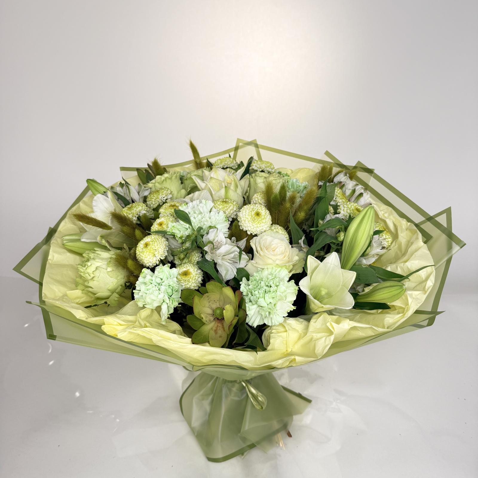Состав: роза 7, гвоздика 6, альстромерия 5, хризантема кустовая 5, леукадендрон 2, лилия 2 и прочее. под заказ