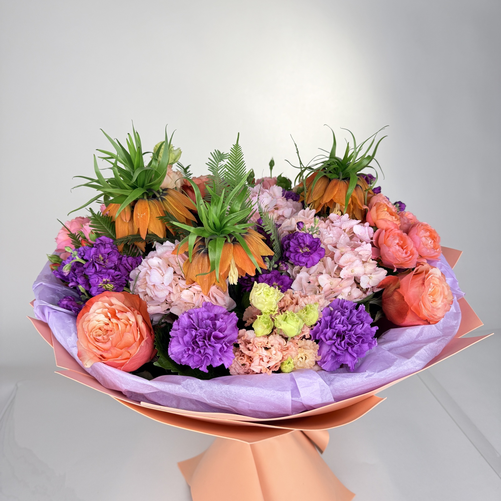 Состав: гвоздика 7, роза кустовая 3, гортензия 3, лизиантус 3, маттиола 3, роза 3, салал 0,5 и прочее.