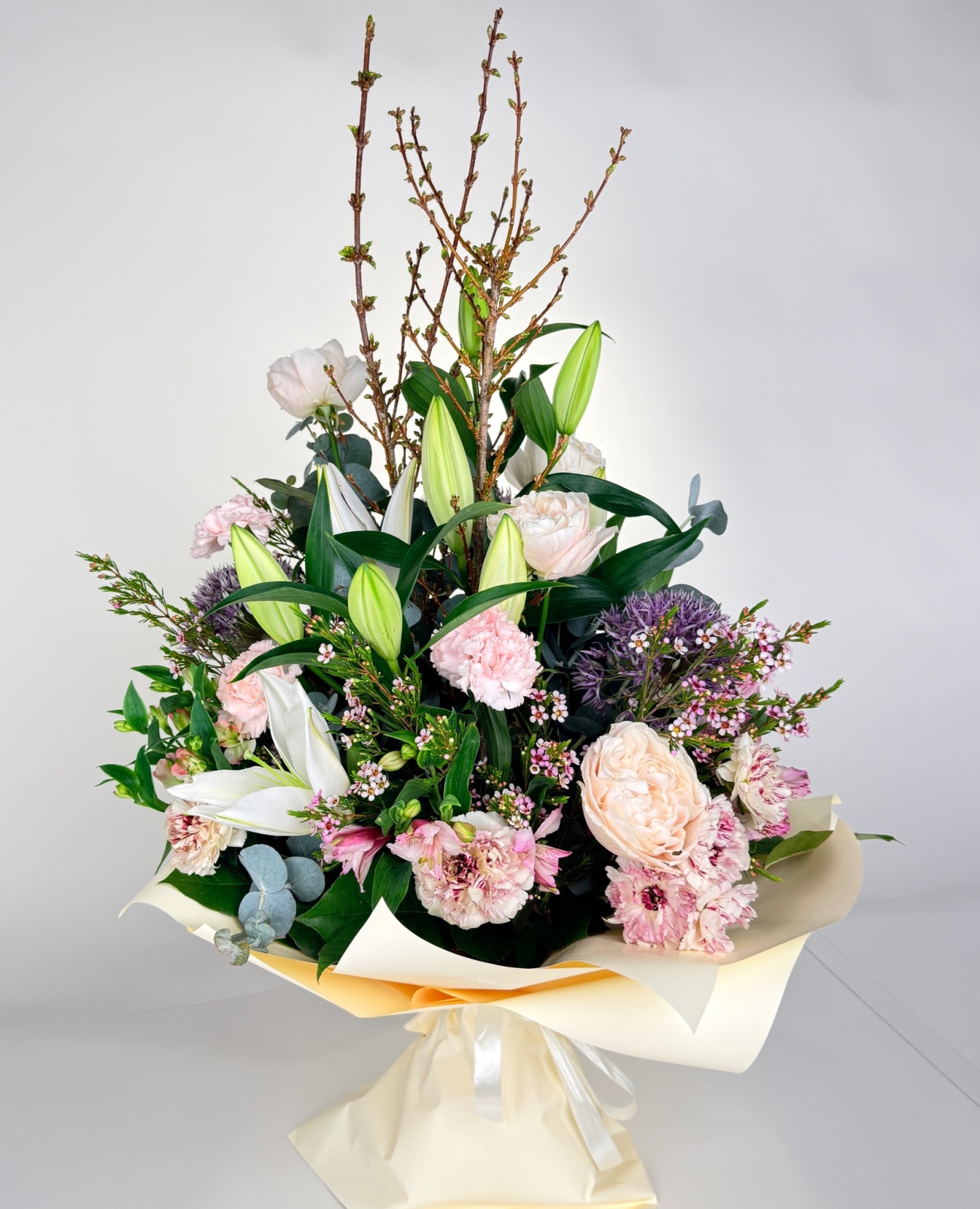 Состав: ранункулюс 8, роза 5, альстромерия 5, гвоздика 4, хамелациум 4, лилия 3, эвкалипт 2 и прочее. в наличии