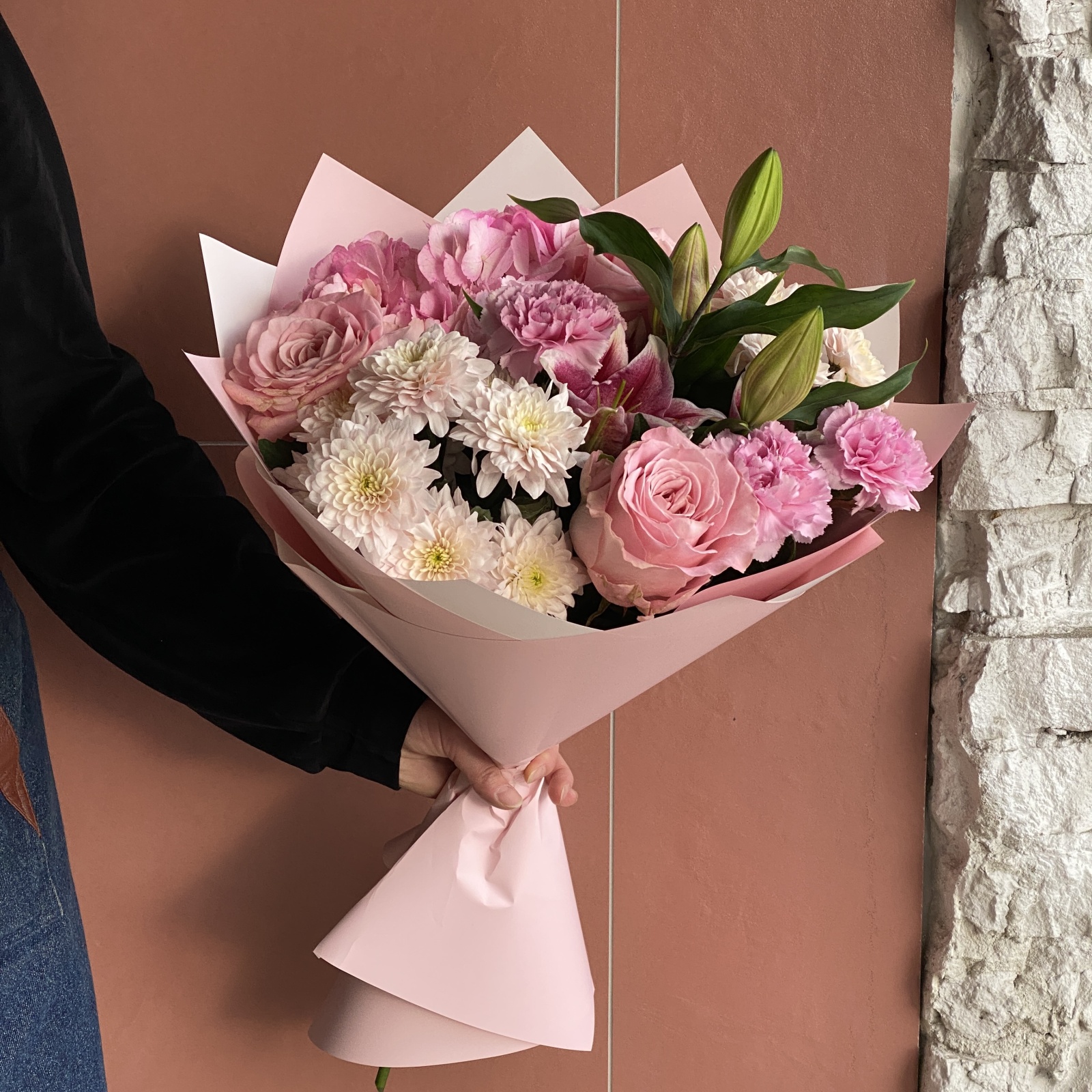 Состав: роза 3, гвоздика 3, хризантема кустовая 2, гортензия 1, лилия 1, фисташка 0,5 и прочее. под заказ