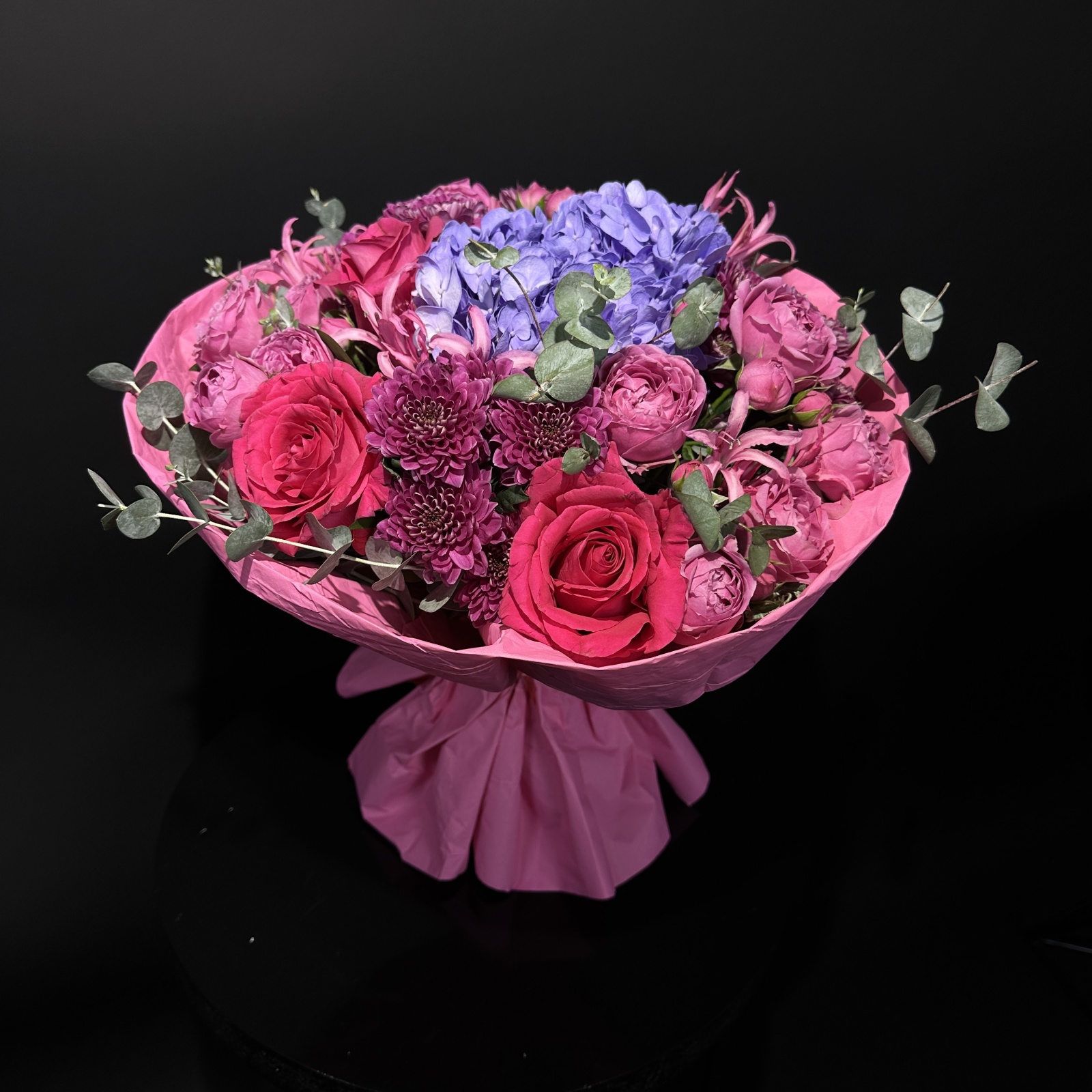 Состав: роза 5, хризантема кустовая 4, роза кустовая 3, гортензия 1, эвкалипт 1, рускус 0,5 и прочее. под заказ