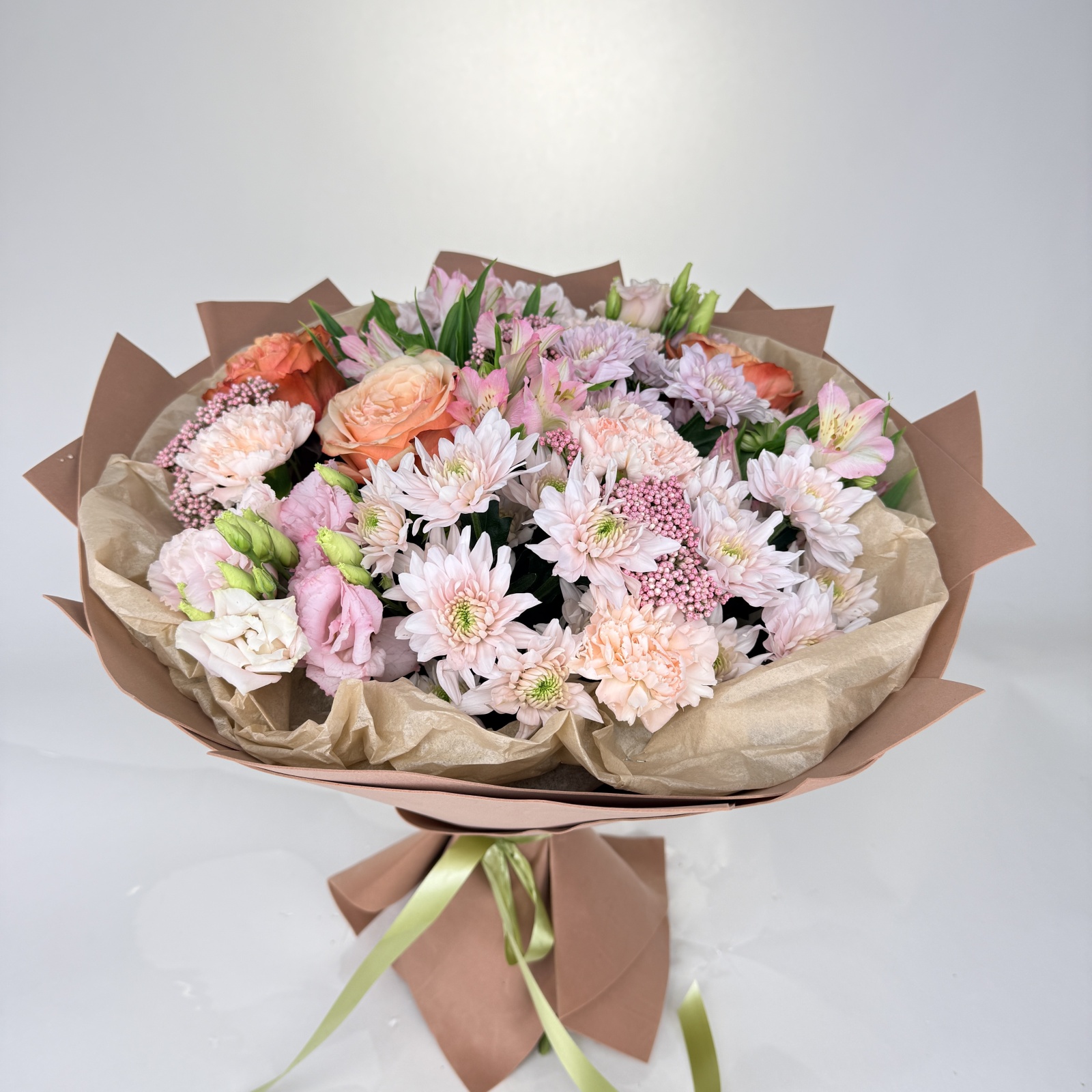 Состав: гвоздика 5, хризантема кустовая 4, роза 3, альстромерия 3, лизиантус 2 и прочее. в наличии