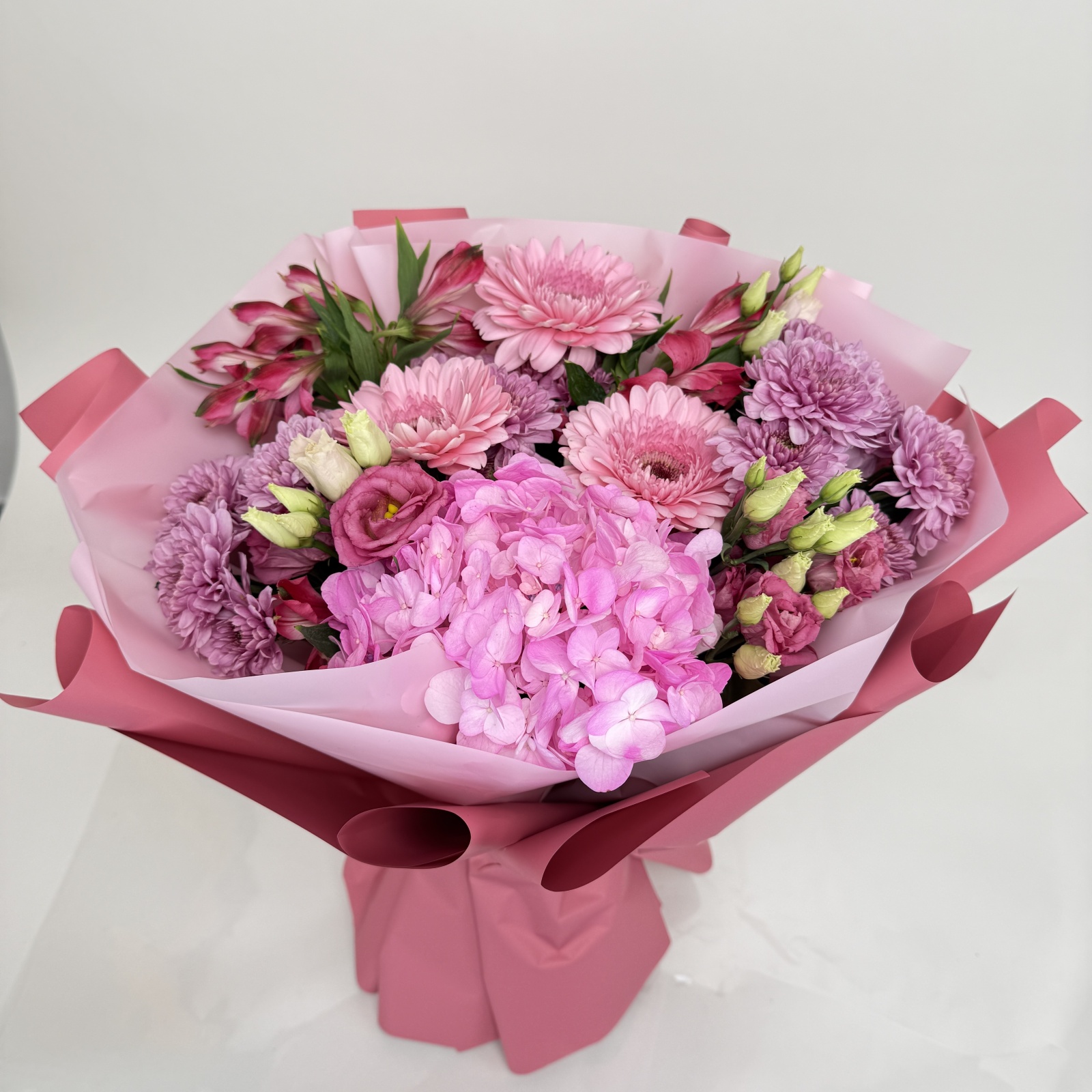 Состав: альстромерия 3, хризантема кустовая 3, гербера 3, лизиантус 3, гортензия 1, фисташка 0,5 и прочее. под заказ