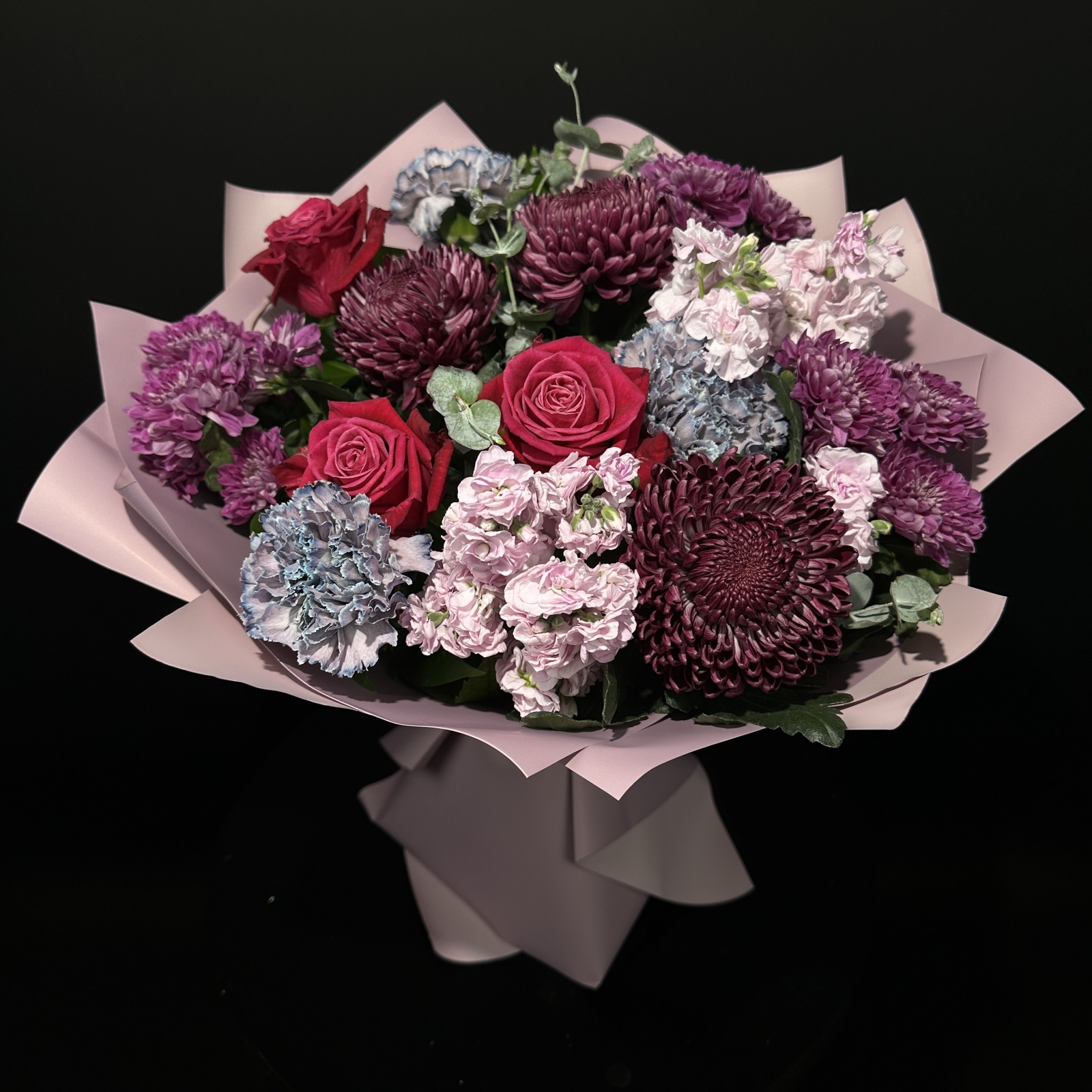 Состав: хризантема 3, роза 3, гвоздика 3, хризантема кустовая 3, маттиола 2, эвкалипт 1, рускус 0,5 и прочее. в наличии