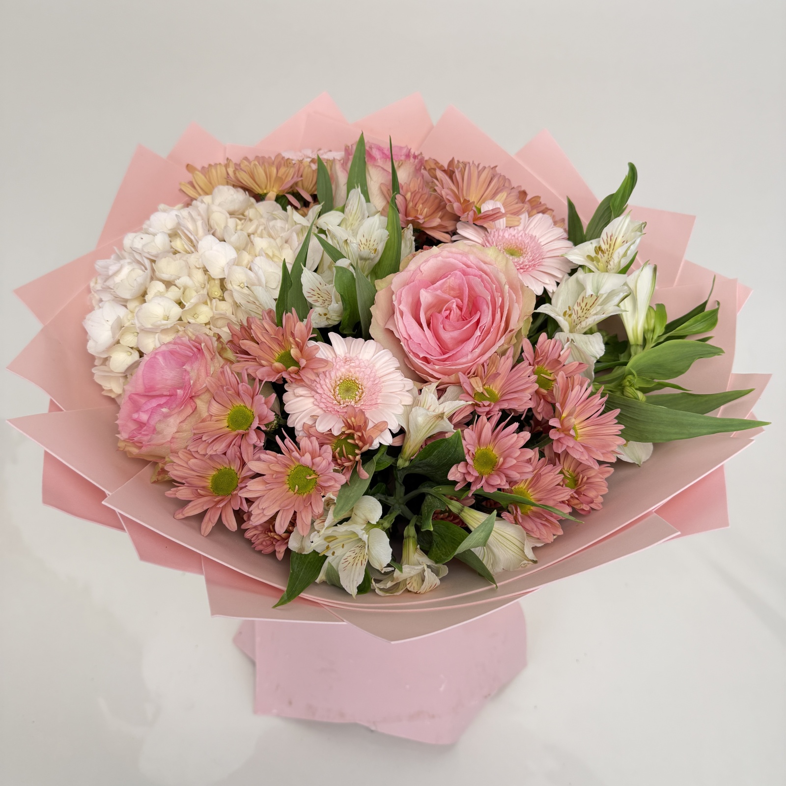 Состав: роза 4, хризантема кустовая 3, альстромерия 3, гербера 3, гортензия 1, фисташка 1 и прочее.