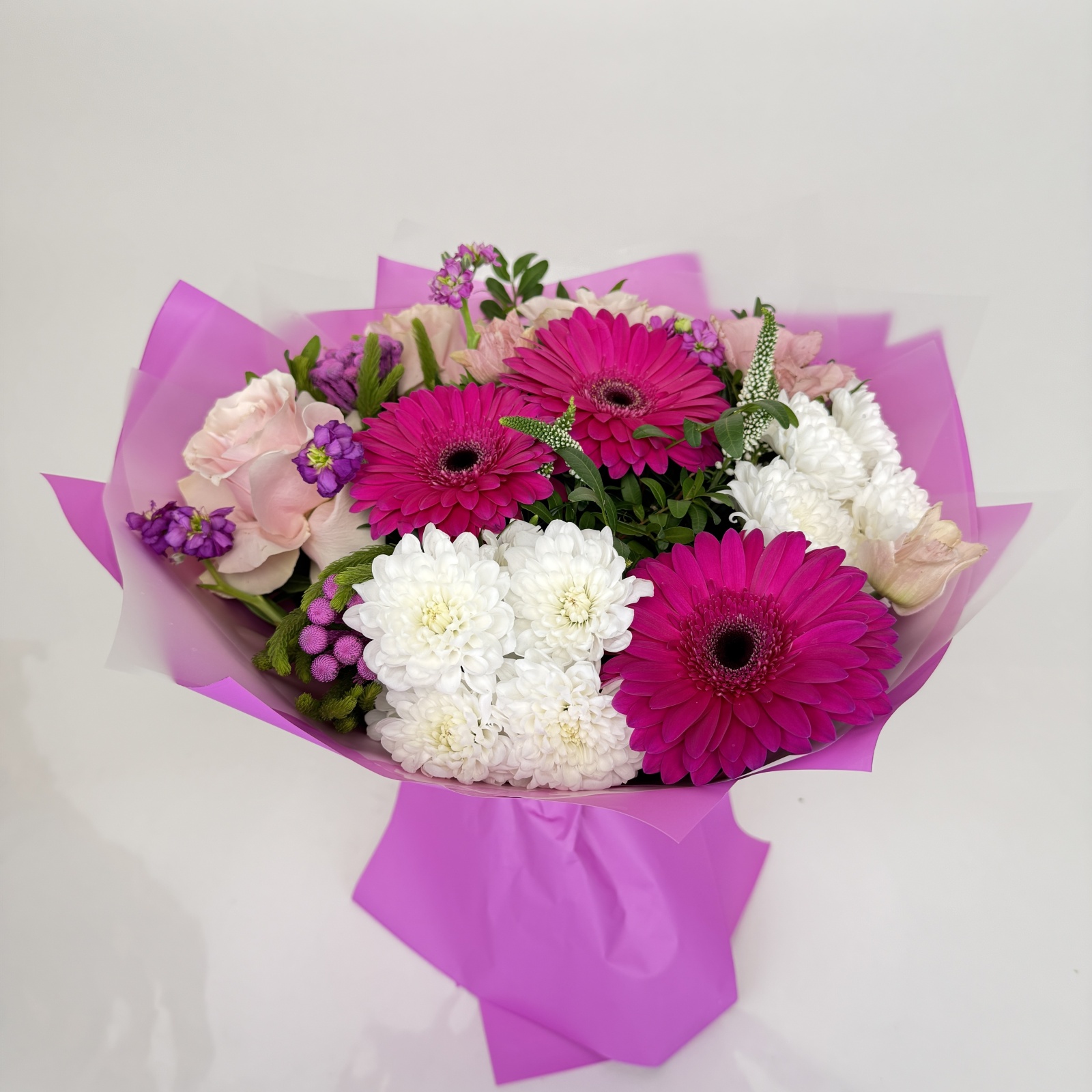 Состав: анемон 4, бруния 3, роза 3, гербера 3, хризантема кустовая 2, маттиола 2, фисташка 0,5 и прочее. под заказ