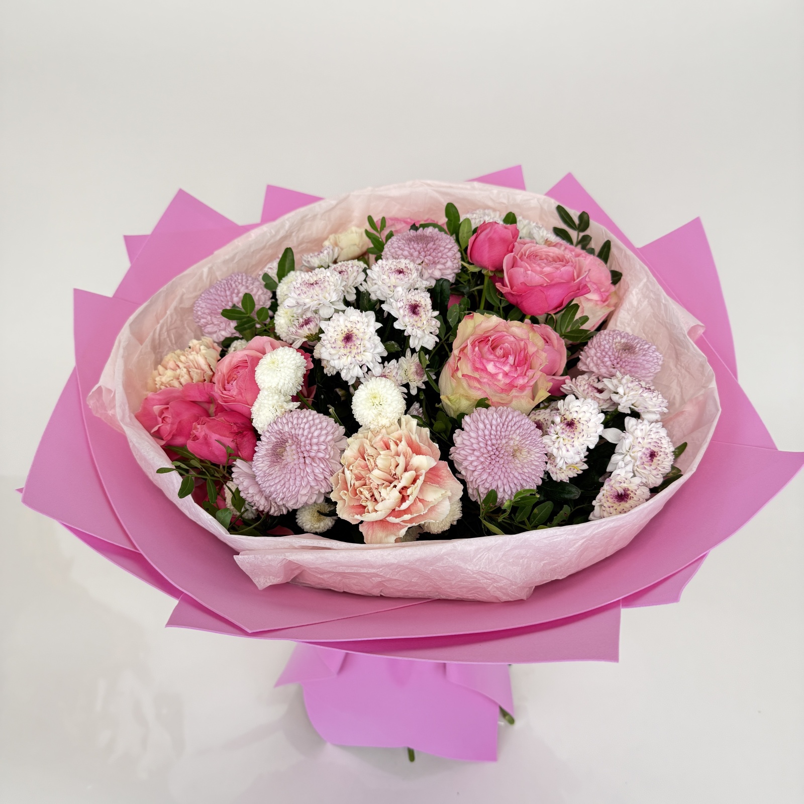 Состав: хризантема кустовая 6, хризантема 5, роза 3, гвоздика 3, роза кустовая 2 и прочее. под заказ