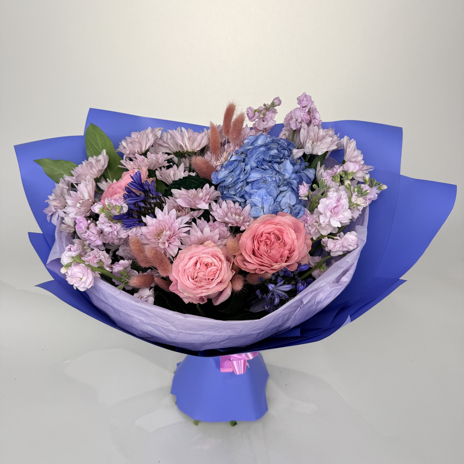 Состав: хризантема кустовая 5, маттиола 3, роза 3, гортензия 1, салал 0,5 и прочее. под заказ