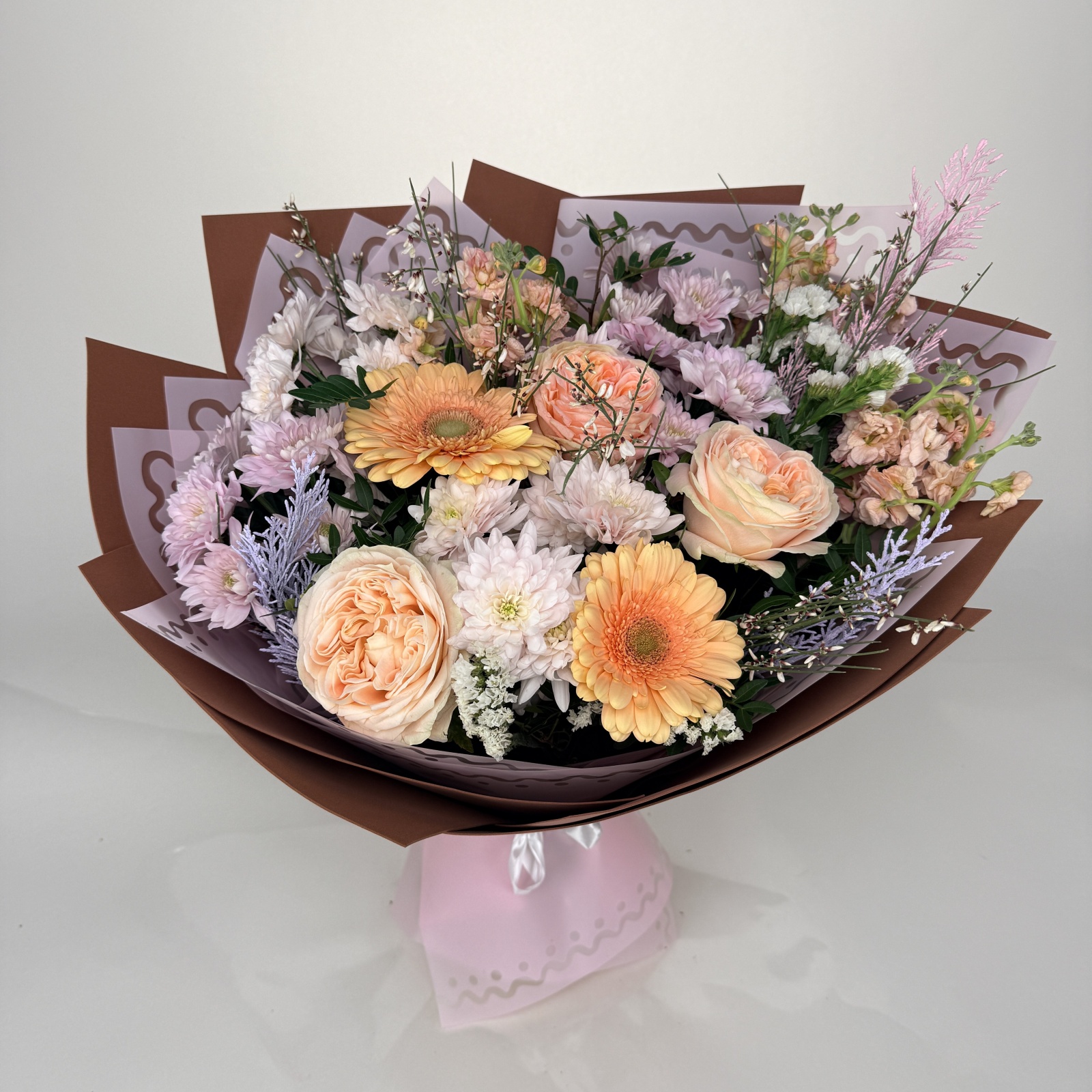 Состав: хризантема кустовая 5, маттиола 3, роза 3, гербера 2, статица 1, фисташка 0,5 и прочее.