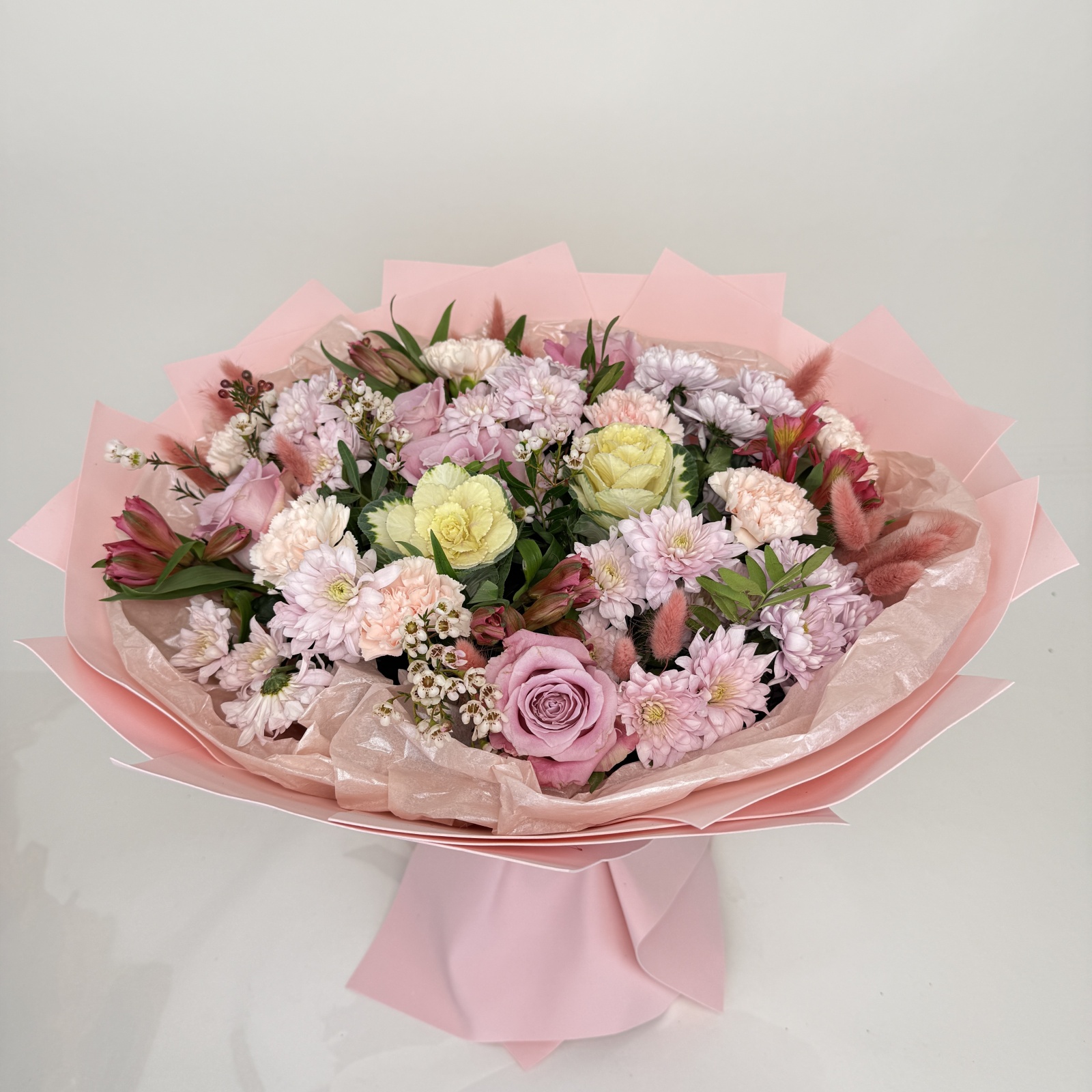 Состав: гвоздика 6, хризантема кустовая 6, роза 5, альстромерия 4, хамелациум 3, фисташка 1 и прочее. под заказ