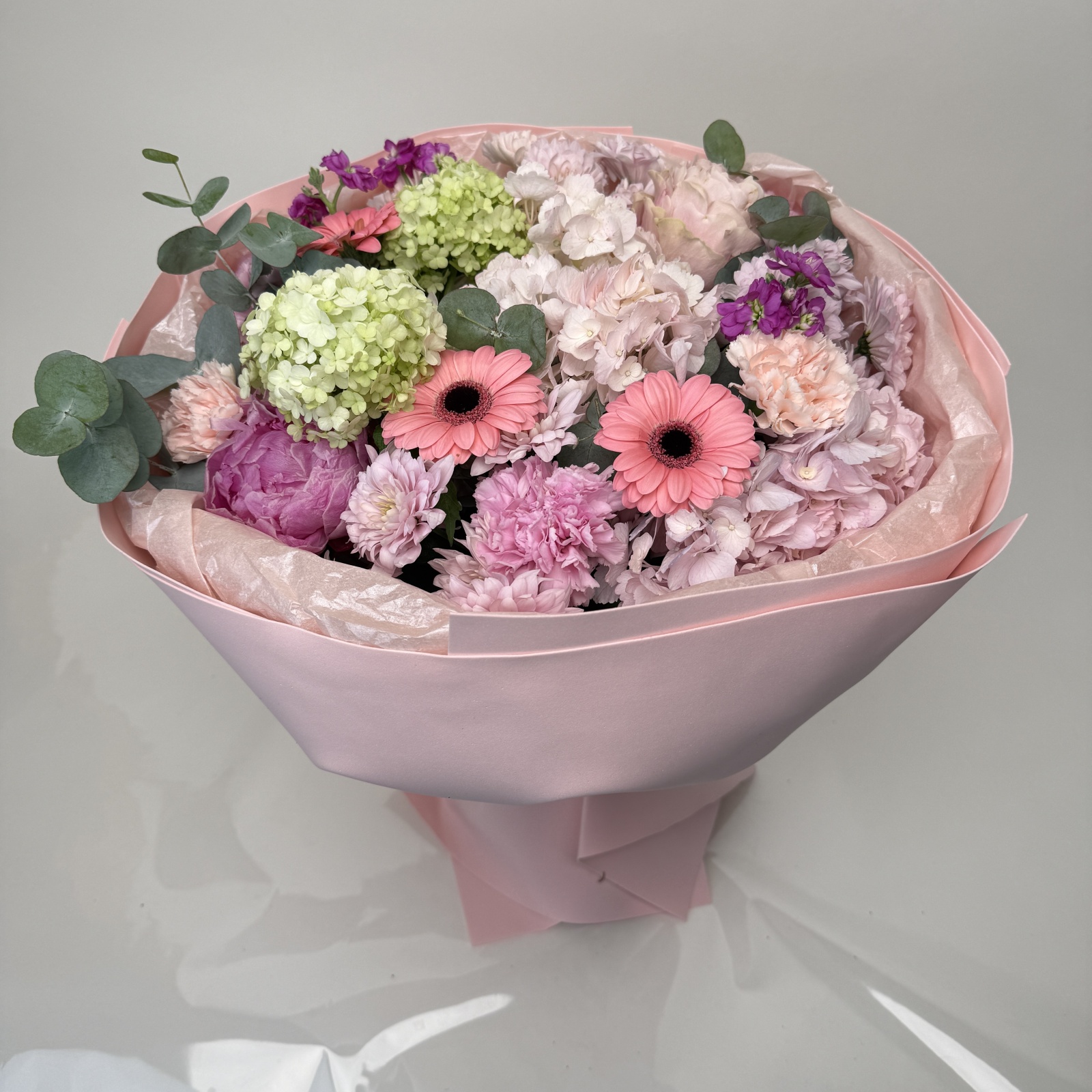 Состав: гвоздика 6, хризантема кустовая 3, гербера 3, гортензия 2, маттиола 2, эвкалипт 2, роза 1, пион 1, вибурнум 1 и прочее.