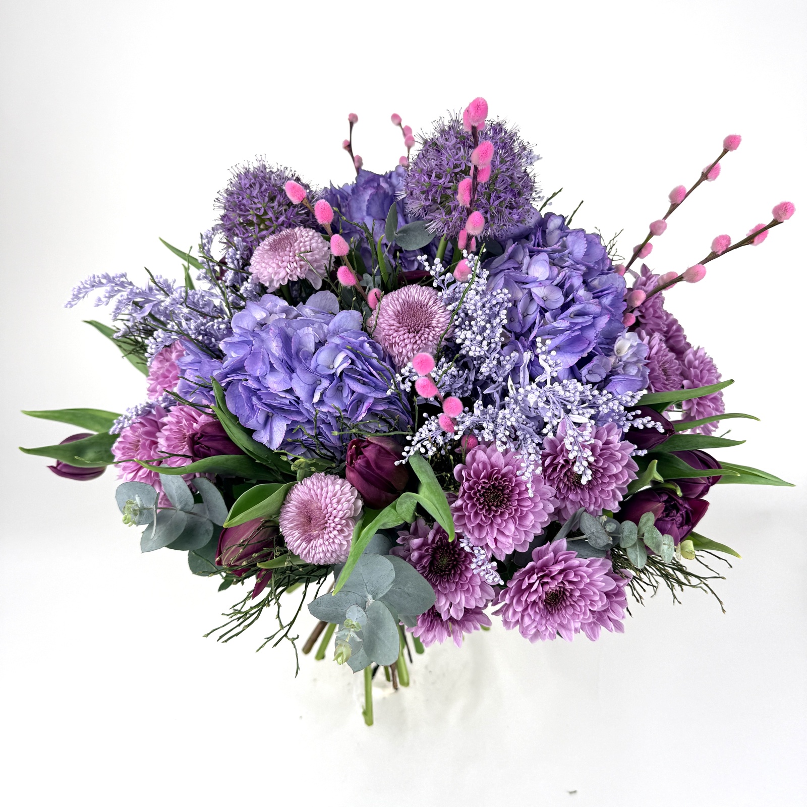 Состав: тюльпан 15, хризантема кустовая 5, гортензия 3, солидаго 3, эвкалипт 1 и прочее.
