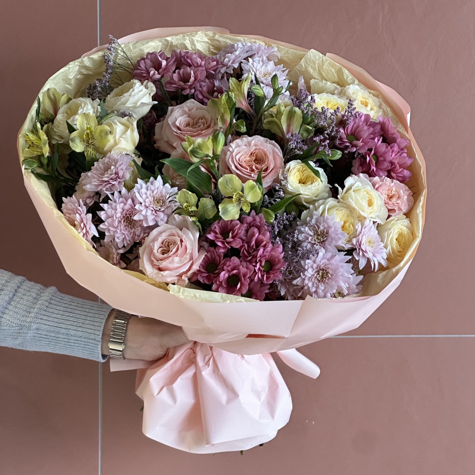 Состав: хризантема кустовая 6, роза 5, альстромерия 3, роза кустовая 3, лимониум 1, фисташка 1 и прочее.