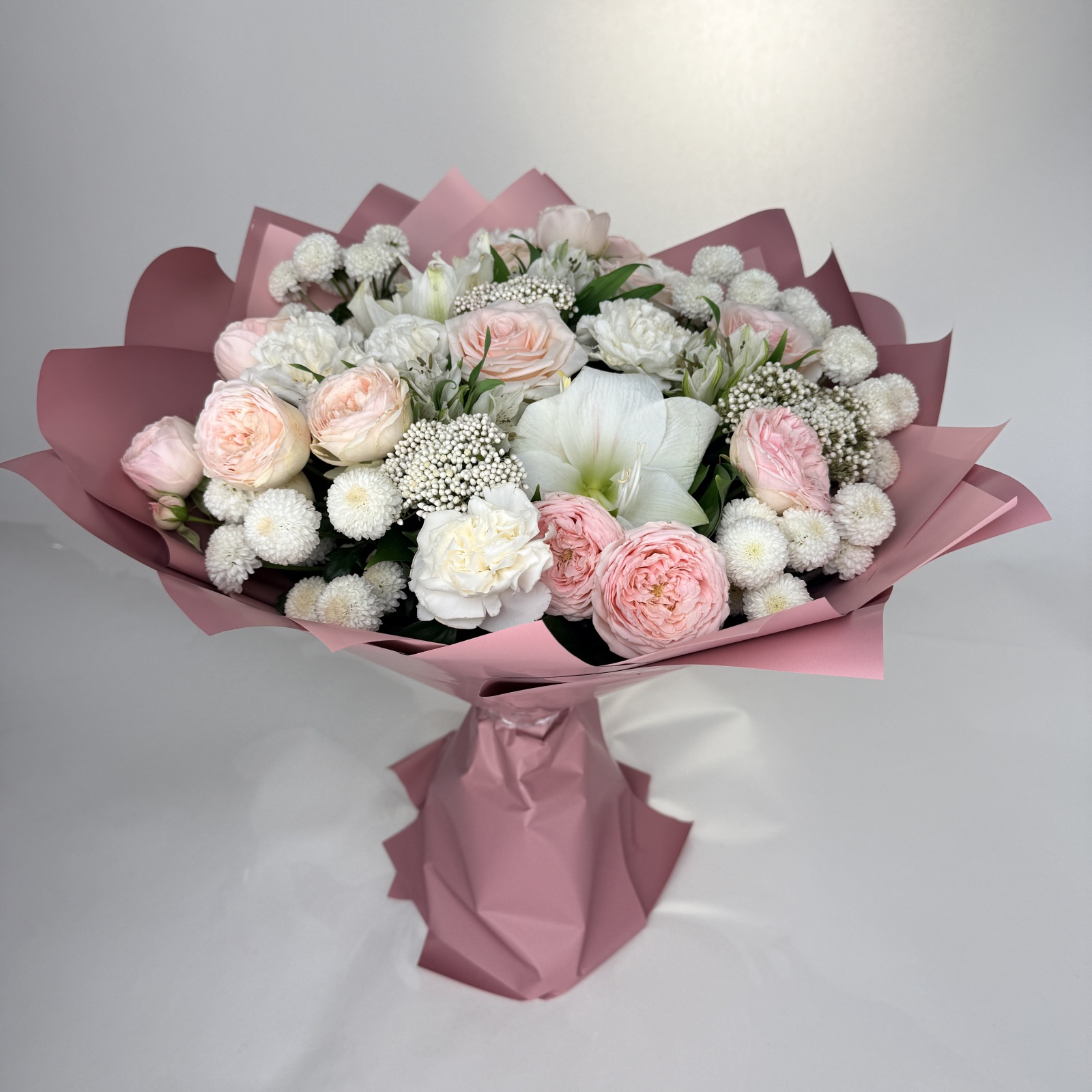 Состав: гвоздика 5, хризантема кустовая 5, роза 3, альстромерия 3, роза кустовая 2, рускус 1 и прочее. в наличии