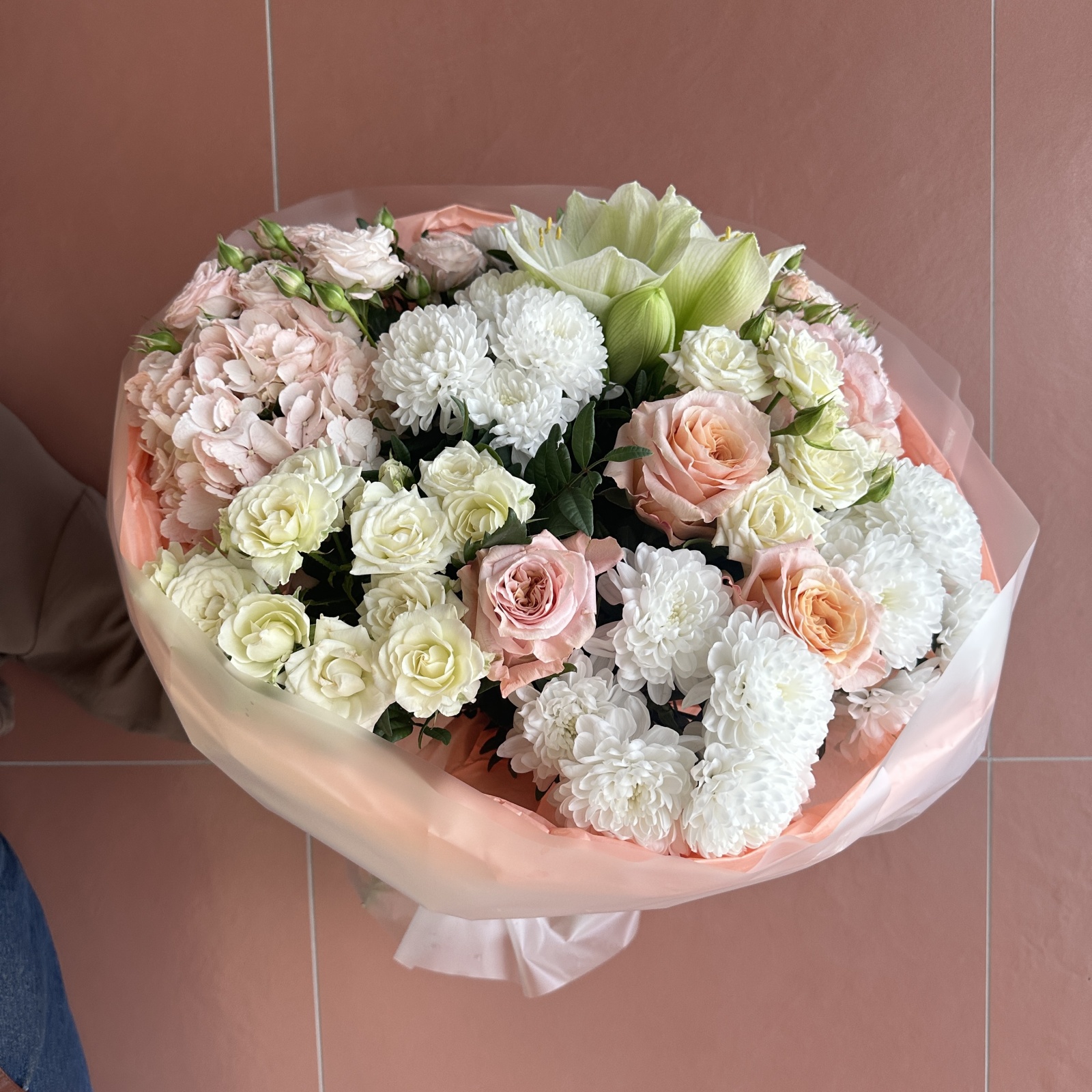 Состав: хризантема кустовая 4, роза кустовая 4, роза 3, гортензия 3, фисташка 1 и прочее.
