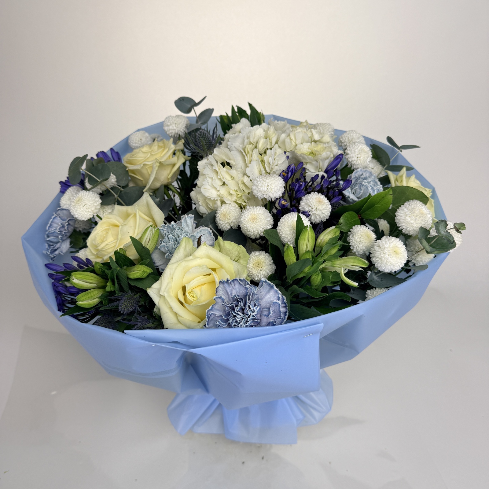 Состав: роза 5, гвоздика 5, хризантема кустовая 5, анемон 5, эрингиум 3, альстромерия 3, эвкалипт 2, гортензия 1, салал 0,5 и прочее. в наличии