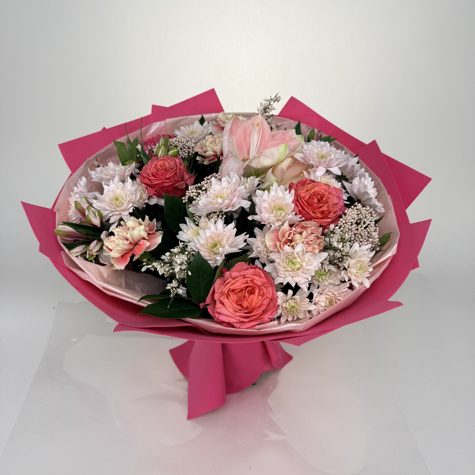 Состав: хризантема кустовая 8, роза 5, альстромерия 3, гербера 3, салал 0,5 и прочее. под заказ