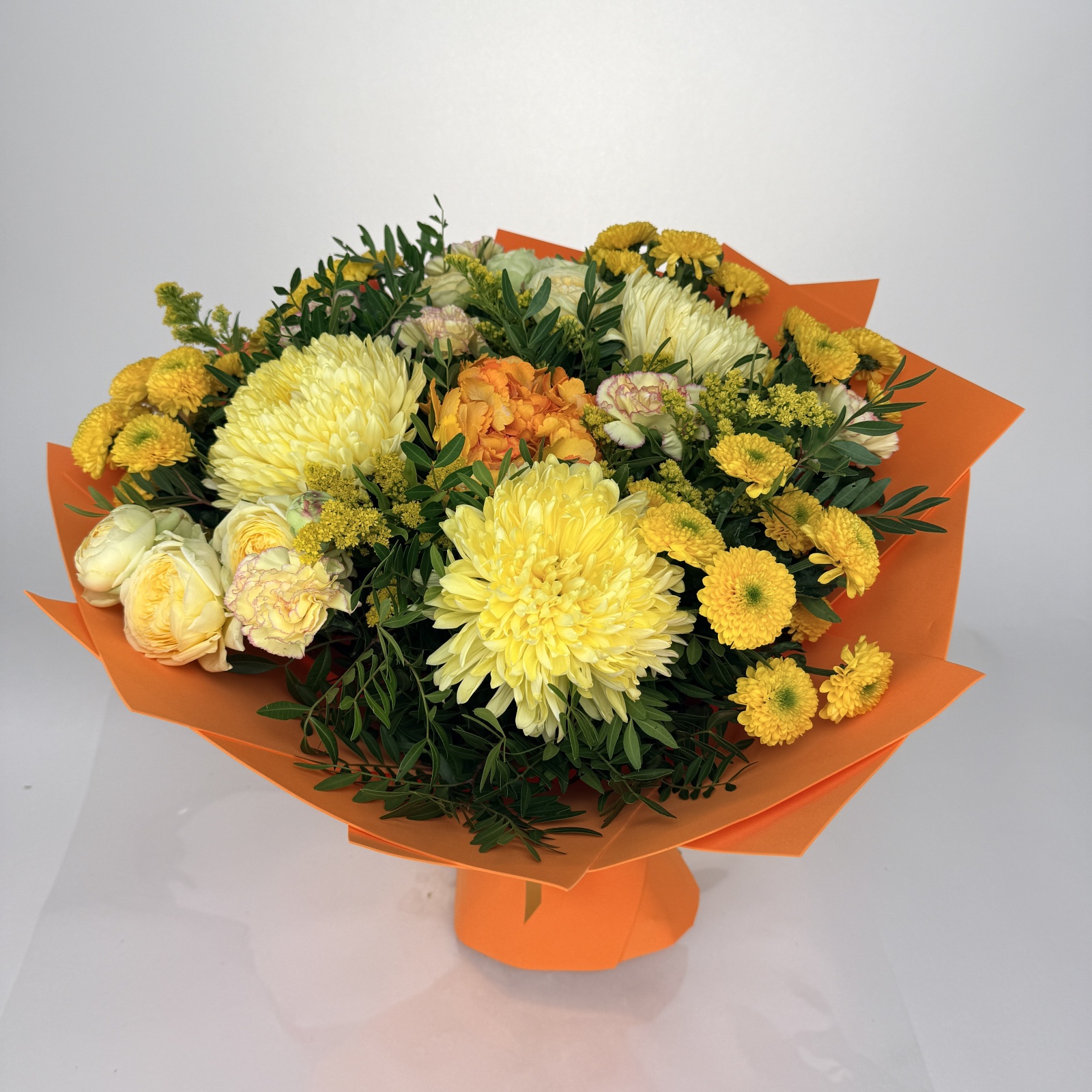 Состав: гвоздика 7, хризантема кустовая 5, солидаго 4, хризантема 4, гортензия 2, роза кустовая 2, фисташка 1 и прочее.