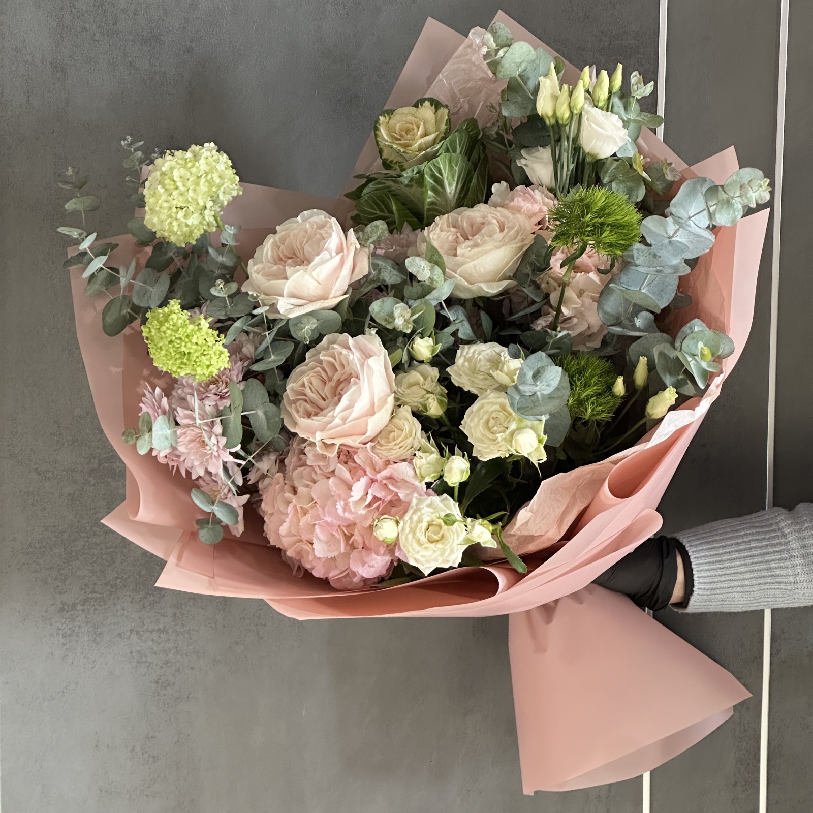 Состав: роза 3, гвоздика 2, эвкалипт 2, хризантема кустовая 2, гортензия 2, вибурнум 1, лизиантус 1, фисташка 1, роза кустовая 1 и прочее. под заказ