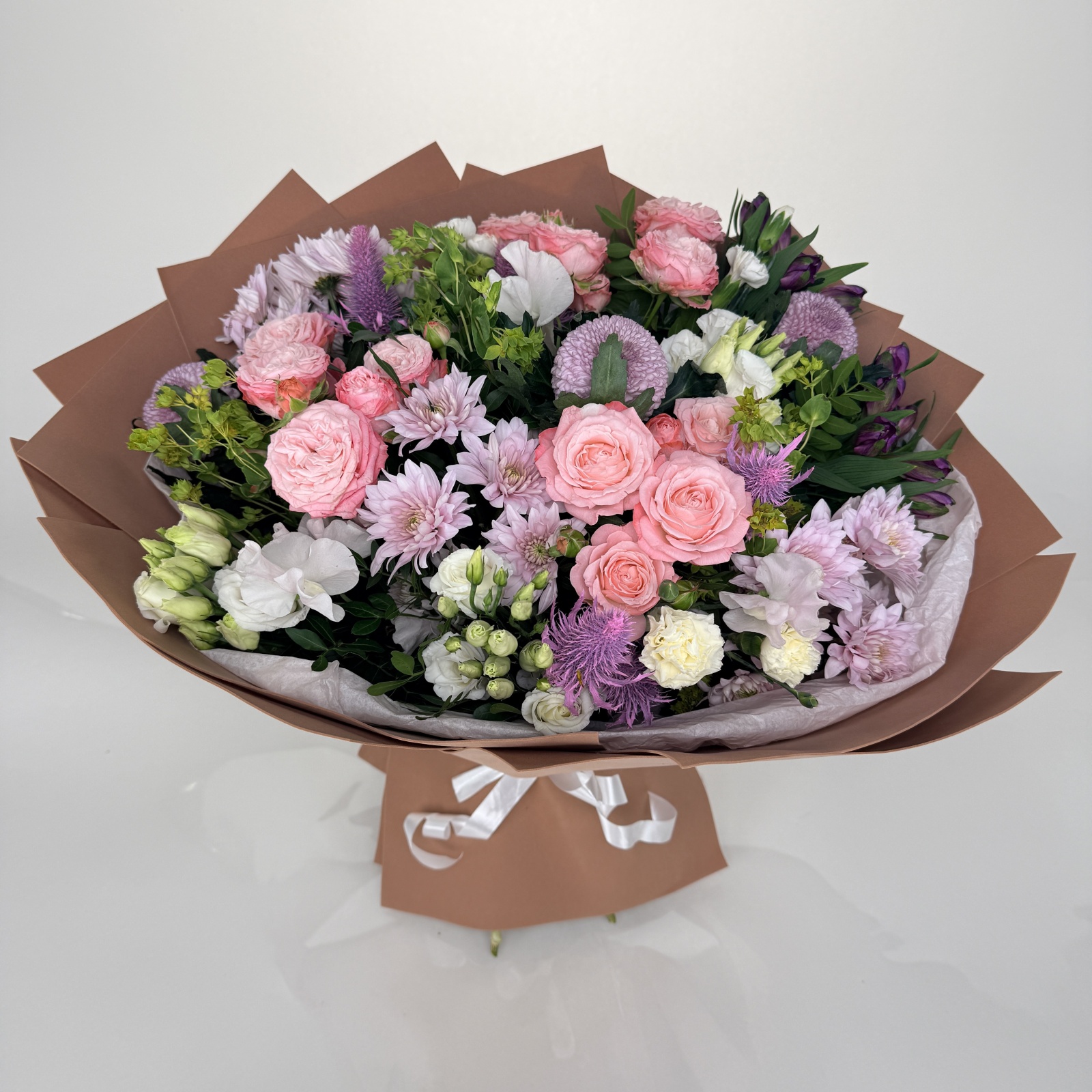 Состав: роза кустовая 3, хризантема кустовая 3, лизиантус 3, хризантема 3, гвоздика 2, альстромерия 2, эрингиум 2, фисташка 1 и прочее.