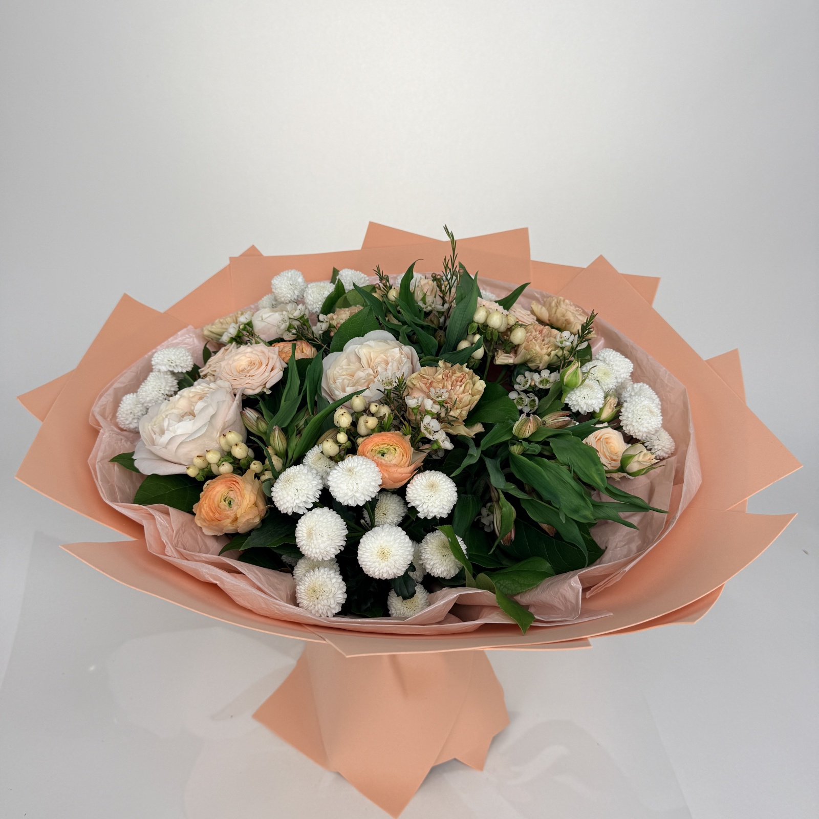 Состав: гвоздика 5, хризантема кустовая 5, анемон 4, гиперикум 4, ранункулюс 3, роза 3, альстромерия 3, роза кустовая 2, хамелациум 2 и прочее.