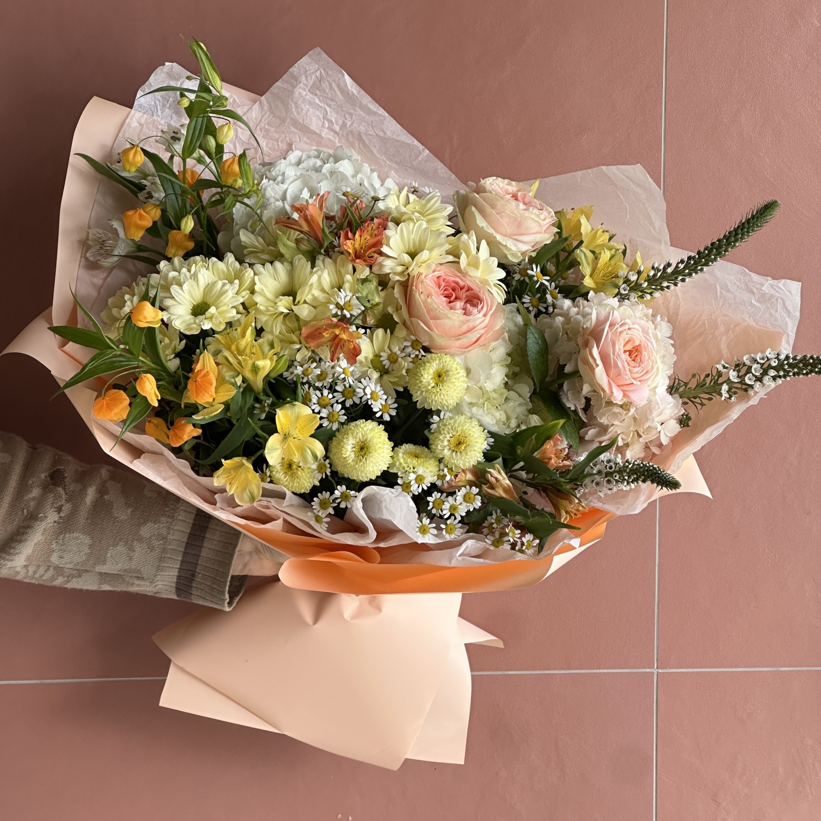 Состав: альстромерия 5, хризантема кустовая 4, гортензия 3, лизимахия 3, роза 3, фисташка 0,5 и прочее. под заказ