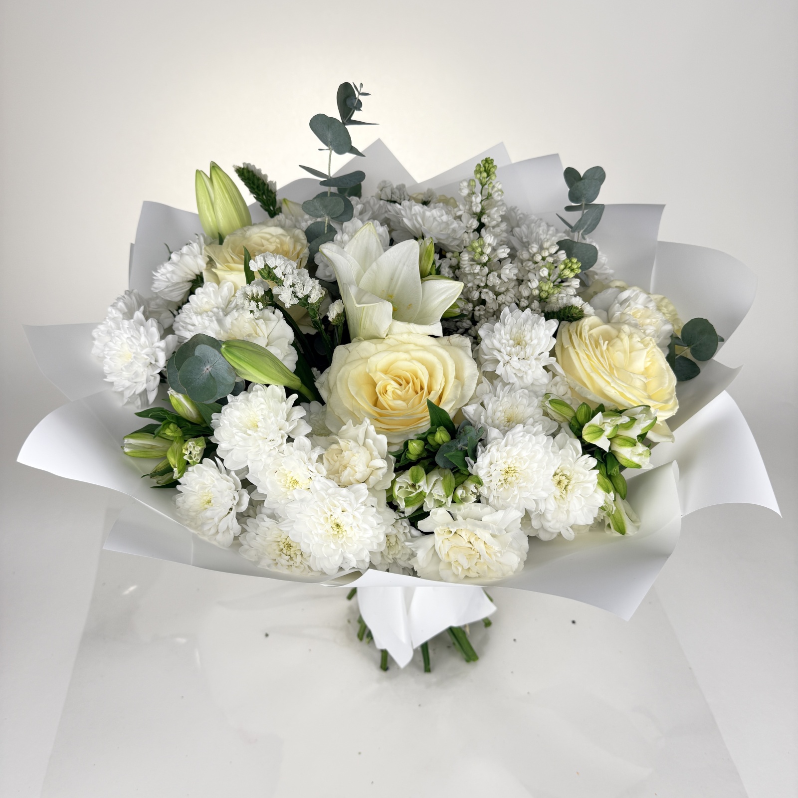 Состав: роза 8, альстромерия 5, гвоздика 5, хризантема кустовая 5, лилия 2, статица 2, сирень 1, фисташка 0,5, рускус 0,5 и прочее.