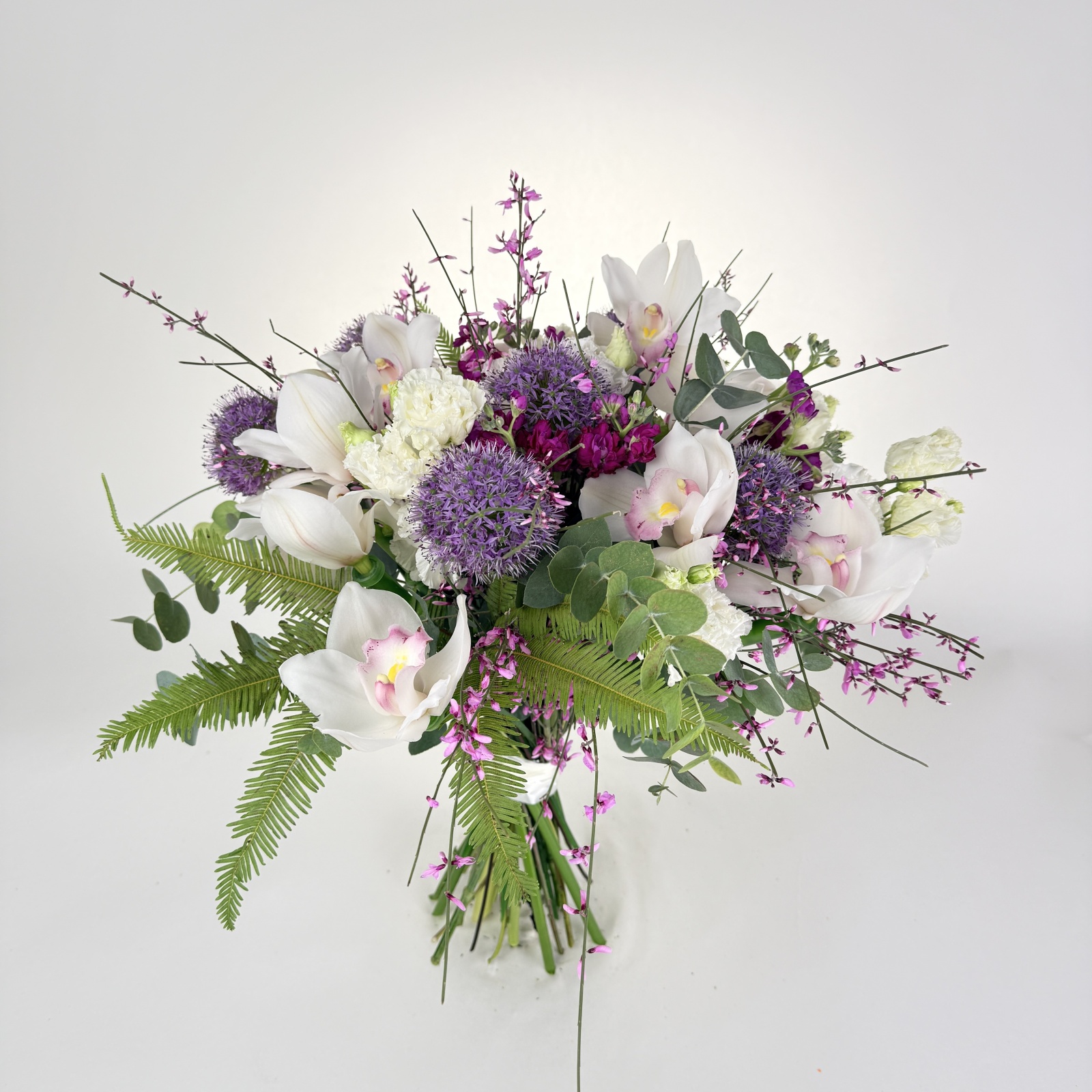 Состав: лизиантус 5, маттиола 3, эвкалипт 2, ветка цимбидиум 1 и прочее. под заказ