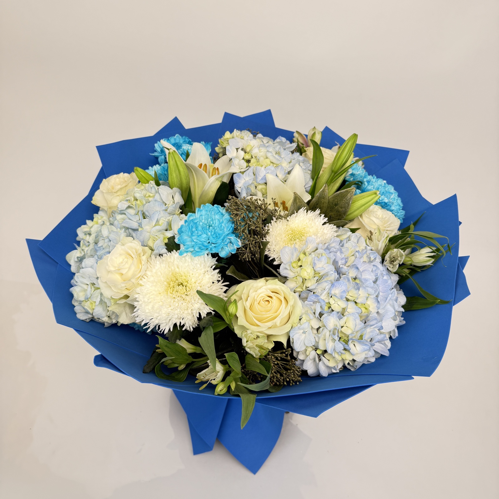 Состав: хризантема кустовая 5, роза 4, гортензия 3, альстромерия 3, лилия 2, хризантема 2 и прочее. под заказ
