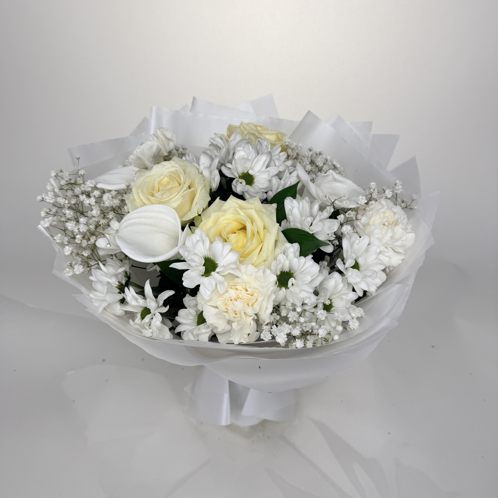 Состав: гвоздика 4, хризантема кустовая 3, роза 3, альстромерия 2, гипсофила 2, рускус 0,5 и прочее. под заказ