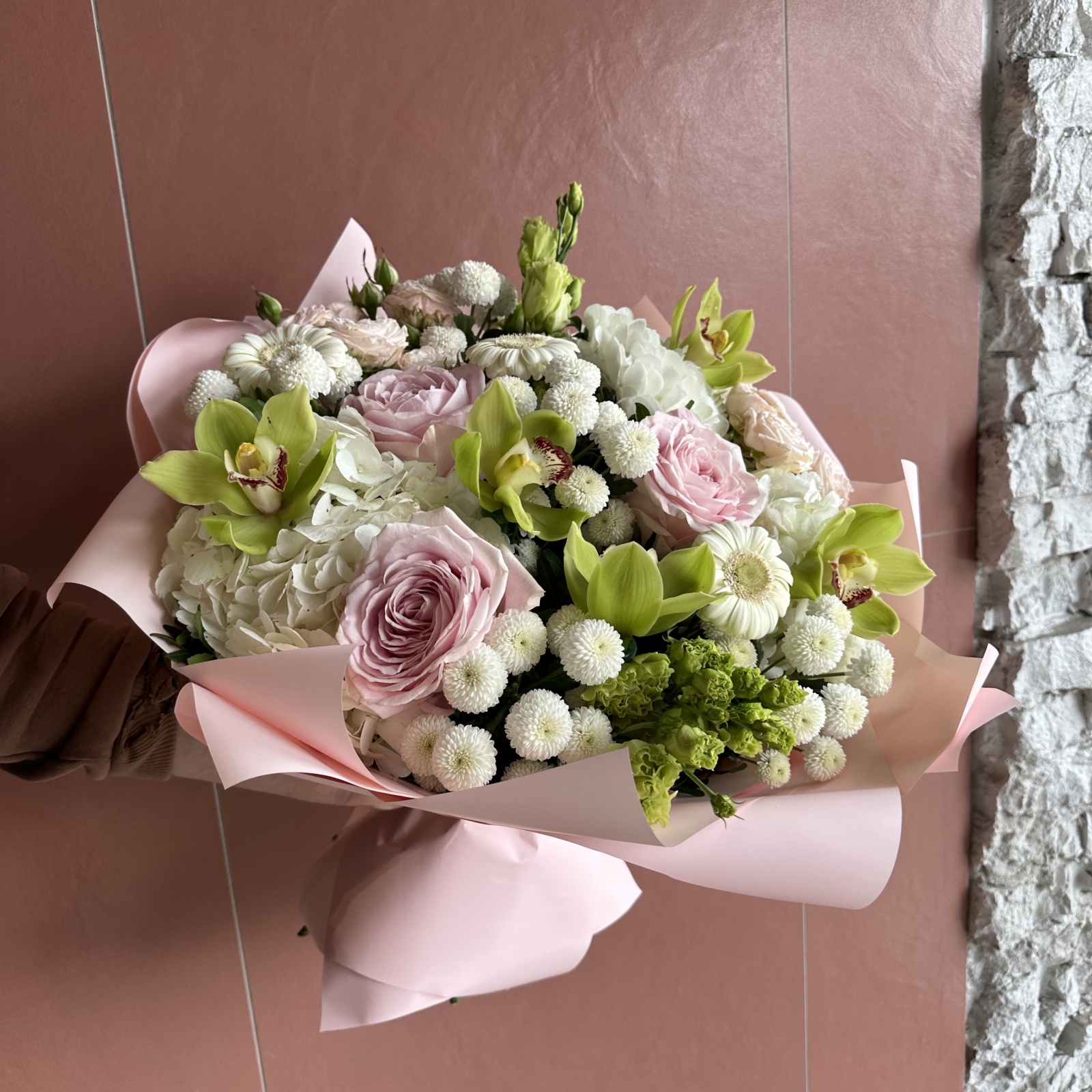 Состав: хризантема кустовая 5, гербера 3, гортензия 3, роза 3, роза кустовая 2, лизиантус 2, фисташка 1, ветка цимбидиум 0,5 и прочее. под заказ