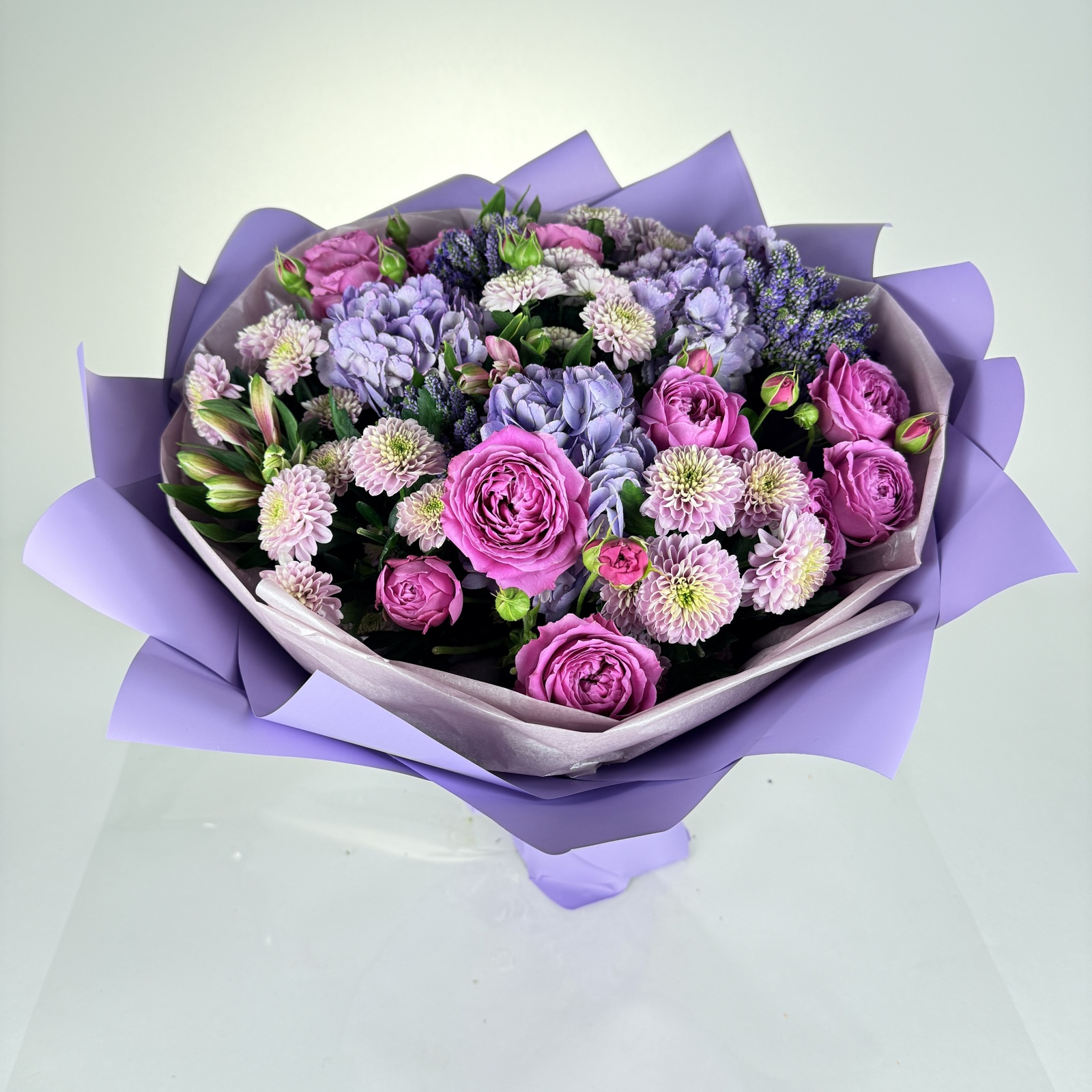 Состав: хризантема кустовая 5, альстромерия 4, роза кустовая 3, гортензия 3, роза 2, рускус 0,5 и прочее. под заказ