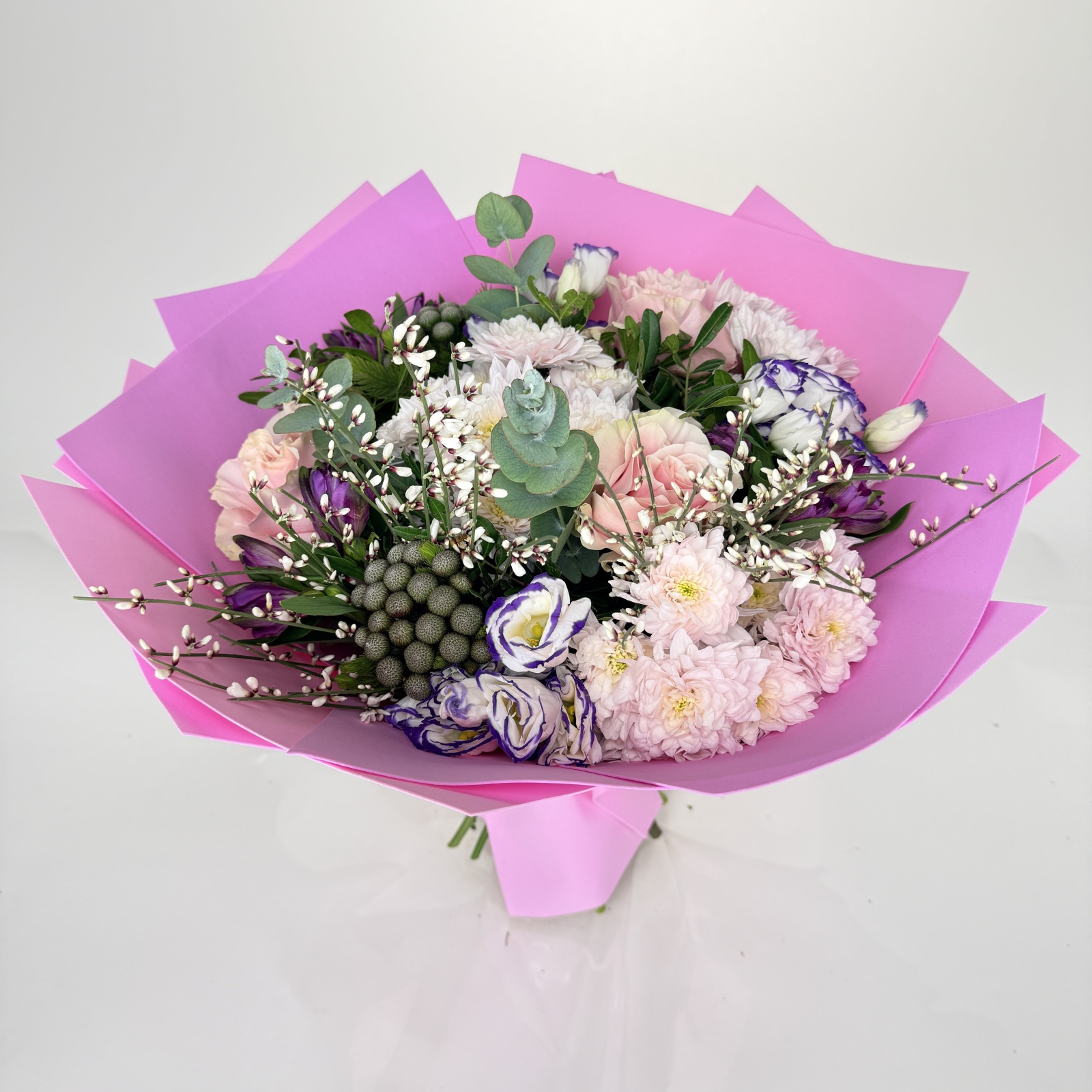 Состав: роза 3, альстромерия 3, хризантема кустовая 3, лизиантус 3, бруния 2, фисташка 0,5 и прочее. под заказ
