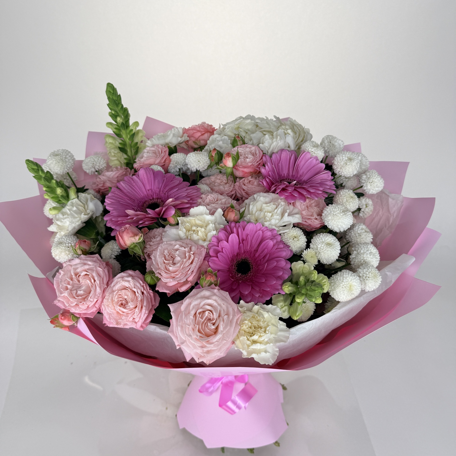 Состав: гвоздика 5, хризантема кустовая 5, гербера 3, роза кустовая 3, антирринум 3, гортензия 1, салал 0,5 и прочее.