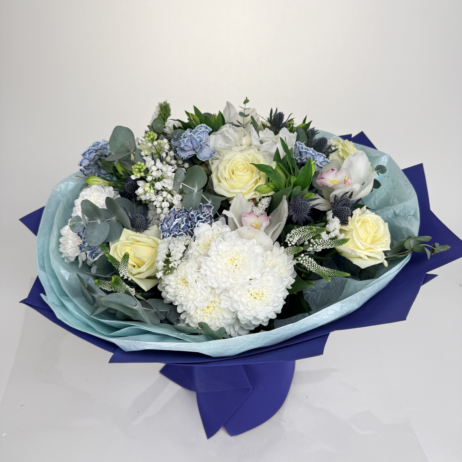 Состав: роза 6, альстромерия 6, гвоздика 6, эрингиум 4, хризантема кустовая 3, эвкалипт 2, сирень 1, рускус 1, ветка цимбидиум 0,2 и прочее.