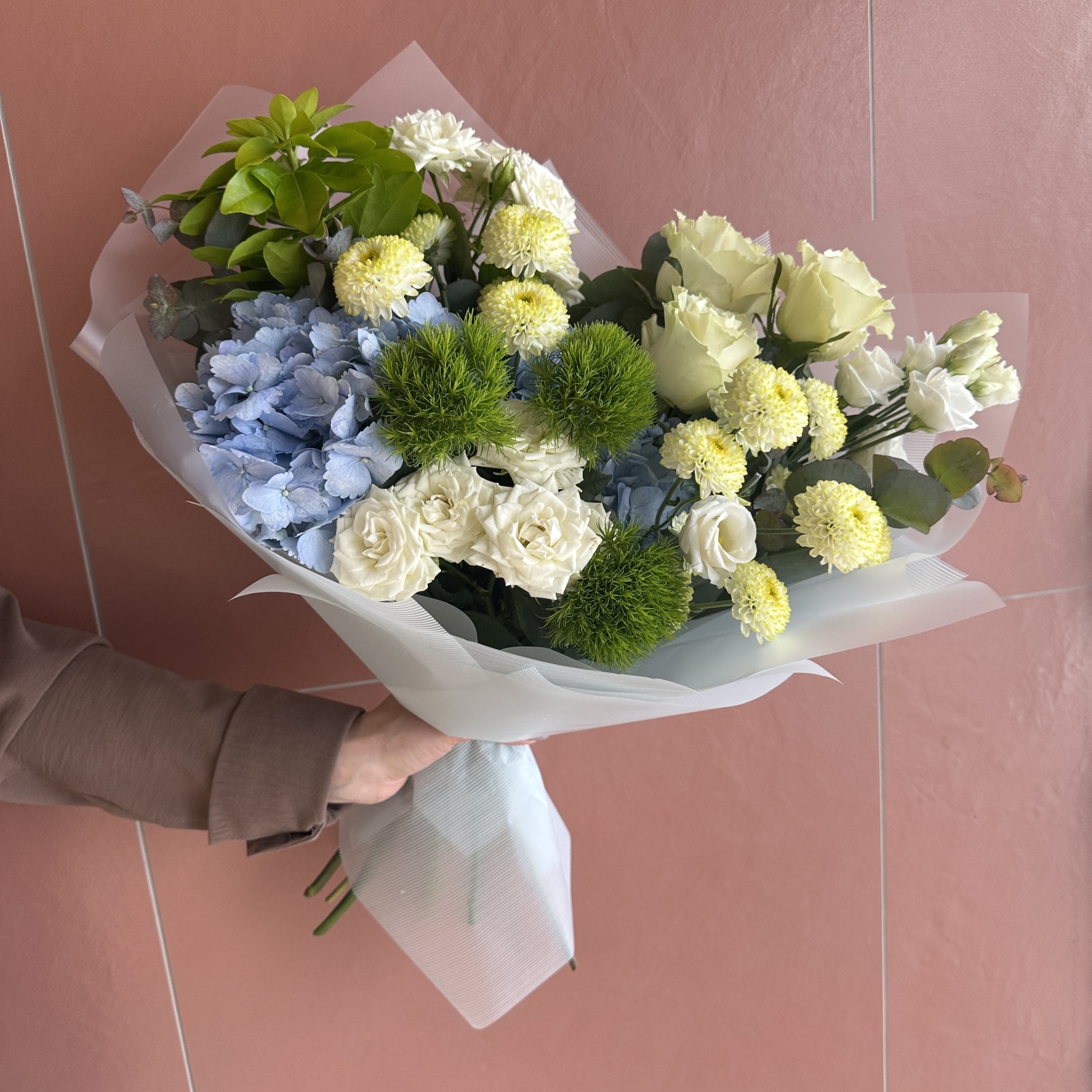 Состав: роза 3, гвоздика 3, роза кустовая 2, хризантема кустовая 2, гортензия 2, эвкалипт 2, лизиантус 1 и прочее. под заказ