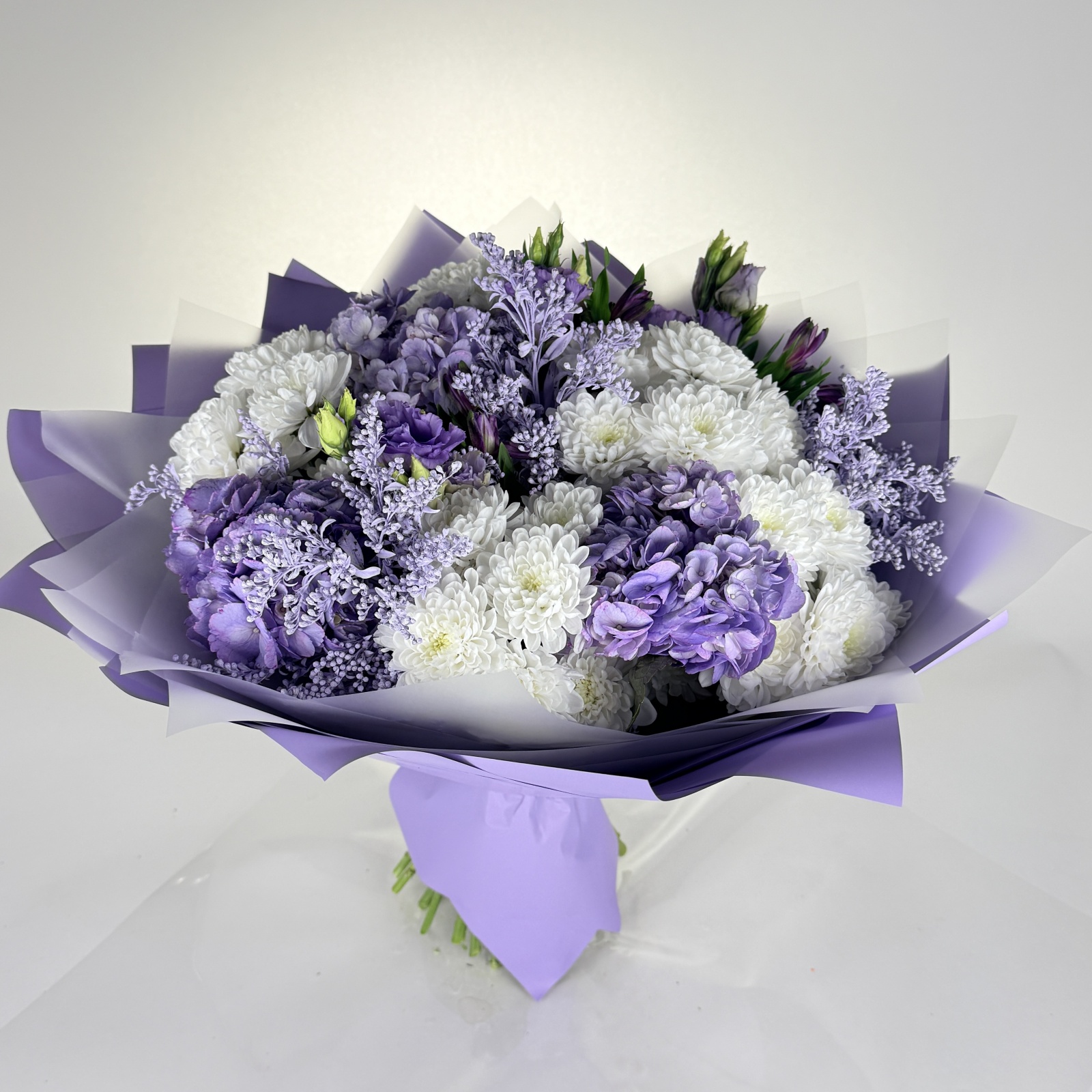 Состав: гвоздика 6, хризантема кустовая 5, гортензия 3, лизиантус 3, солидаго 3, альстромерия 3, рускус 0,5 и прочее.