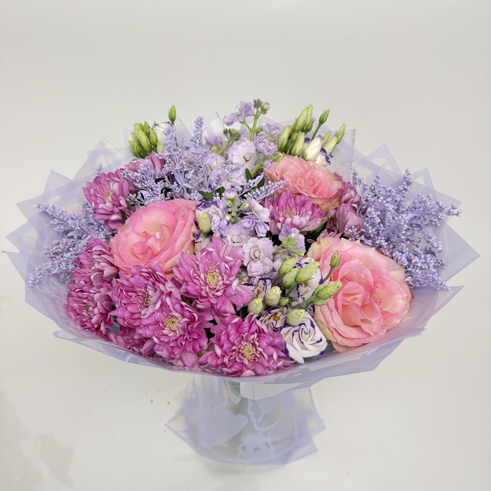 Состав: хризантема кустовая 3, лизиантус 3, солидаго 3, роза 3, маттиола 2, фисташка 1 и прочее.