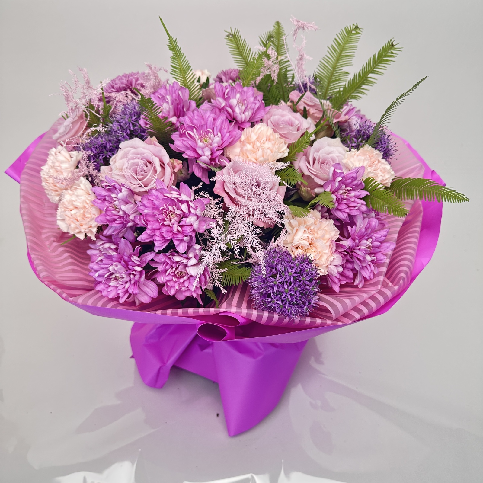 Состав: гвоздика 6, хризантема кустовая 6, роза 5, тюльпан 1, фисташка 1 и прочее. под заказ