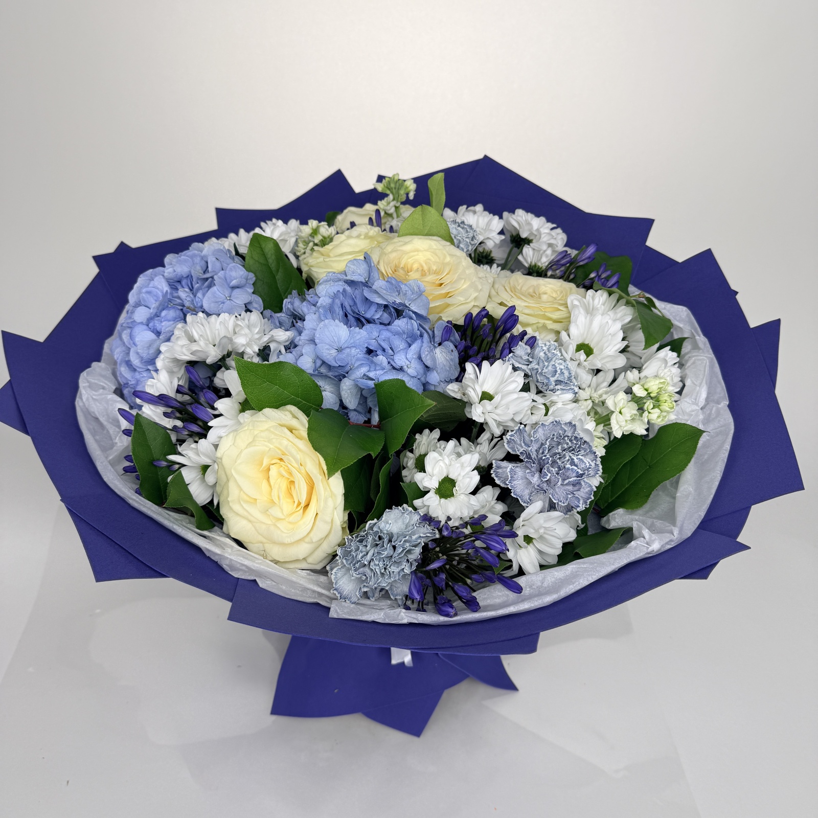 Состав: гвоздика 6, хризантема кустовая 5, маттиола 5, роза 5, гортензия 2, салал 0,5 и прочее.